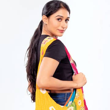 From the imagination of our co-founder and the ingenuity of Artisan Expert Eugenie, these Banana Panel Pop-Up Totes are among our favorites. The Pop Up magic happens when the bottom banana panel of the bag is pressed into the bottom fabric panel, converting the bag from flat to WOW! Dress it up or dress it down, this bag is a great way to make a statement. It’s lightweight, easy to store, and very unique! Available in four fabrics for 2025 - Navy blue floral Cotton, Coral Accent Cotton, Brown/natural Cotton, and Turquoise Nylon. Fabrics are chosen based on current availability - colours not exactly as shown in images. But you can message us for photos of exact colours! - Measures 11.5" x 11.5" x 5" - Folds flat - Handwoven banana fibres with chevron design - Fabric panel and straps