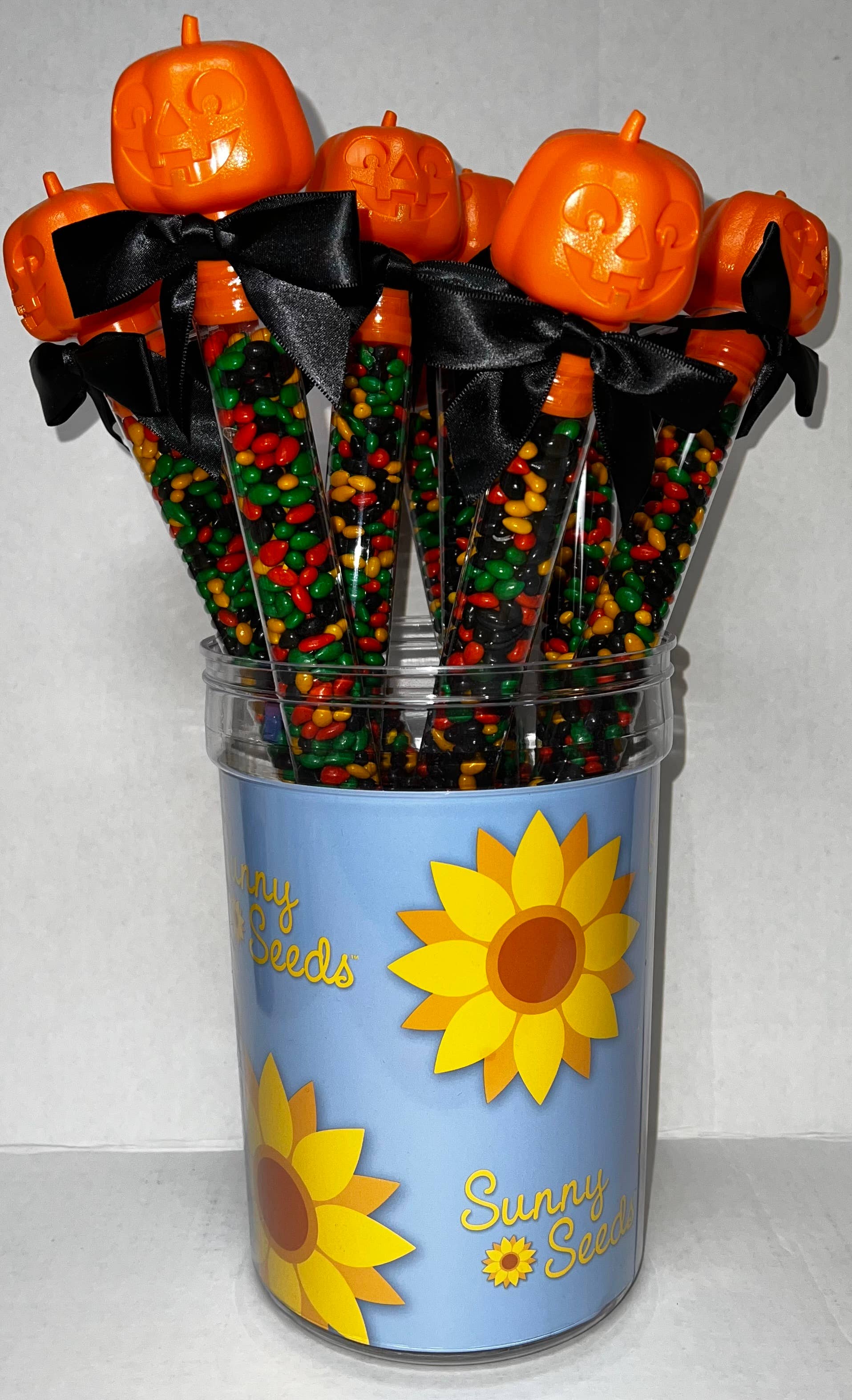 Halloween colored Sunny Seeds - Candy coated, chocolate covered, sunflower seeds. They come in 3 oz tubes with flip top lids. Tubes are filled with our Halloween colored Sunny SeedsĀ®. It's a great treat for all the Trick or Treaters! 24 units/case
