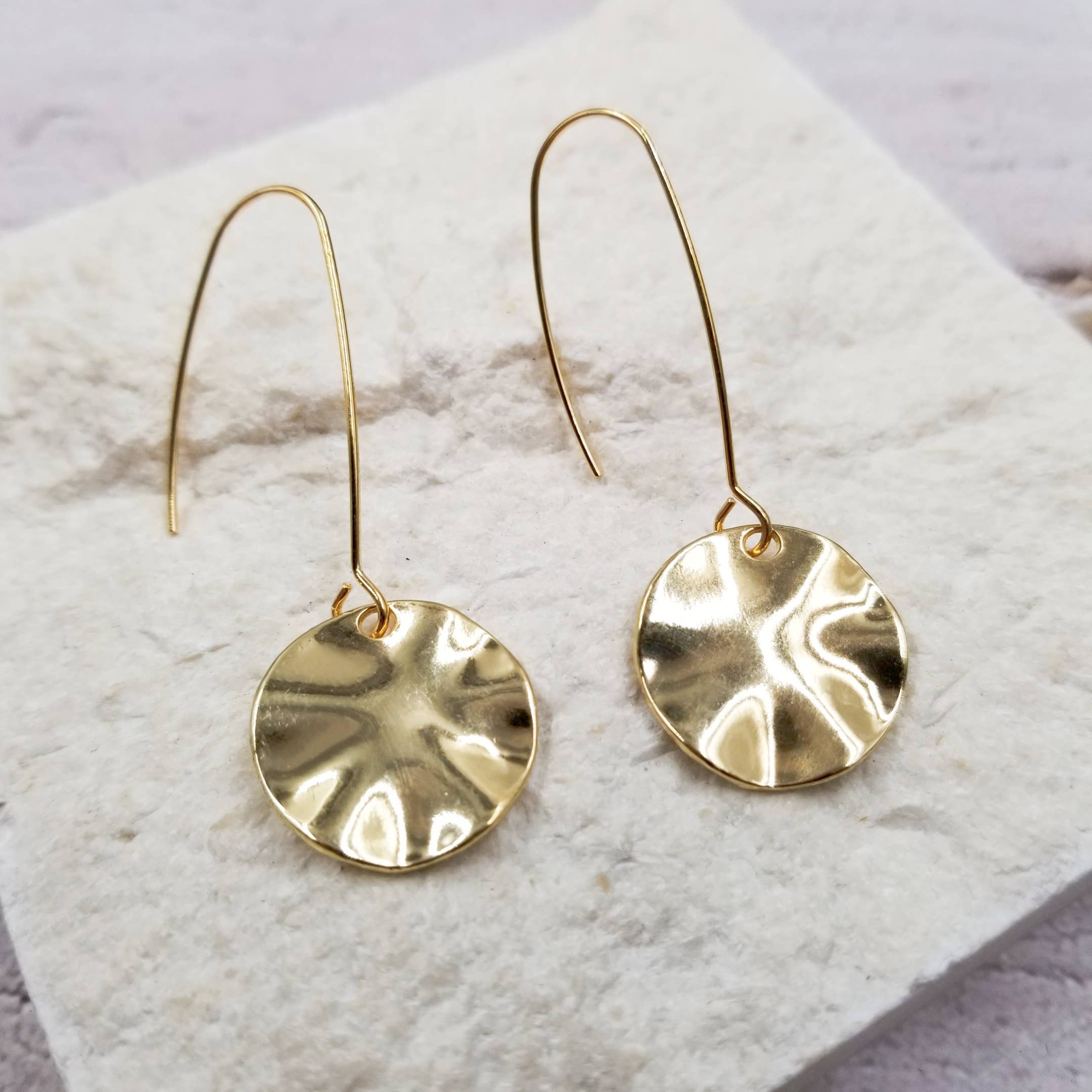 With a name derived from the process of hammering a balled up bit of metal into a beautifully textured disc, this organic design hangs on delicate ear wires. Pair with the Smash Necklace for a cohesive look. * 9mm diameter circles * choose from sterling silver or 14k gold fill