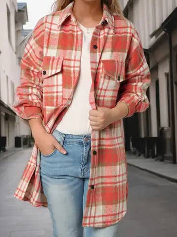 OBX brand Plaid collared flannel shacket with long sleeves. Button front, non-sheer, heavy weight, thick and oversized. Models are wearing a Small. The cute and cozy shacket you've been waiting for!