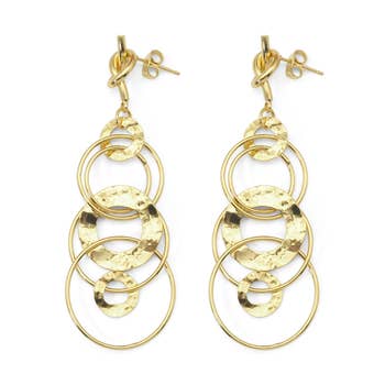 Three playful medallion discs dangle from a french wire to create these elegant everyday earrings. PRODUCT DETAILS: Materials: Pewter plated with 24 kt gold / Sterling silver. Measurements: 1.5" long. Earring closure: French wire Light weight: 0.12 oz.