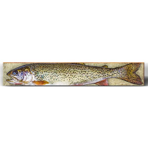 Dive into the serene beauty of nature with our art print featuring a stunning rainbow trout gracefully swimming in shallow waters, painted with bright and vivid colors that bring the fish to life. The different shades of blues used for the water create a sense of depth and movement, enhancing the realism of the scene. Showcase this masterpiece in your living room, to infuse your space with a sense of aquatic charm and artistic allure. • Printed with high resolution giclee inks • Fine art canvas mounted on wood • Solid hardwood frame in shown stain colors • Sustainable American alder wood • Made in the USA in our Utah studio • 12x18" x 1.5" deep w/ 3/4" thick frame • 18x24" x 1.5" deep w/ 3/4" thick frame • 20x30" x 1.5" deep w/ 3/4" thick frame • 24x36" x 1.5" deep w/ 3/4" thick frame • Signs may have +/-1" variations • Signs can stand on a shelf or table or can hang on the wall from the back edge of the frame • Farmhouse style frames have rustic imperfections that make them unique