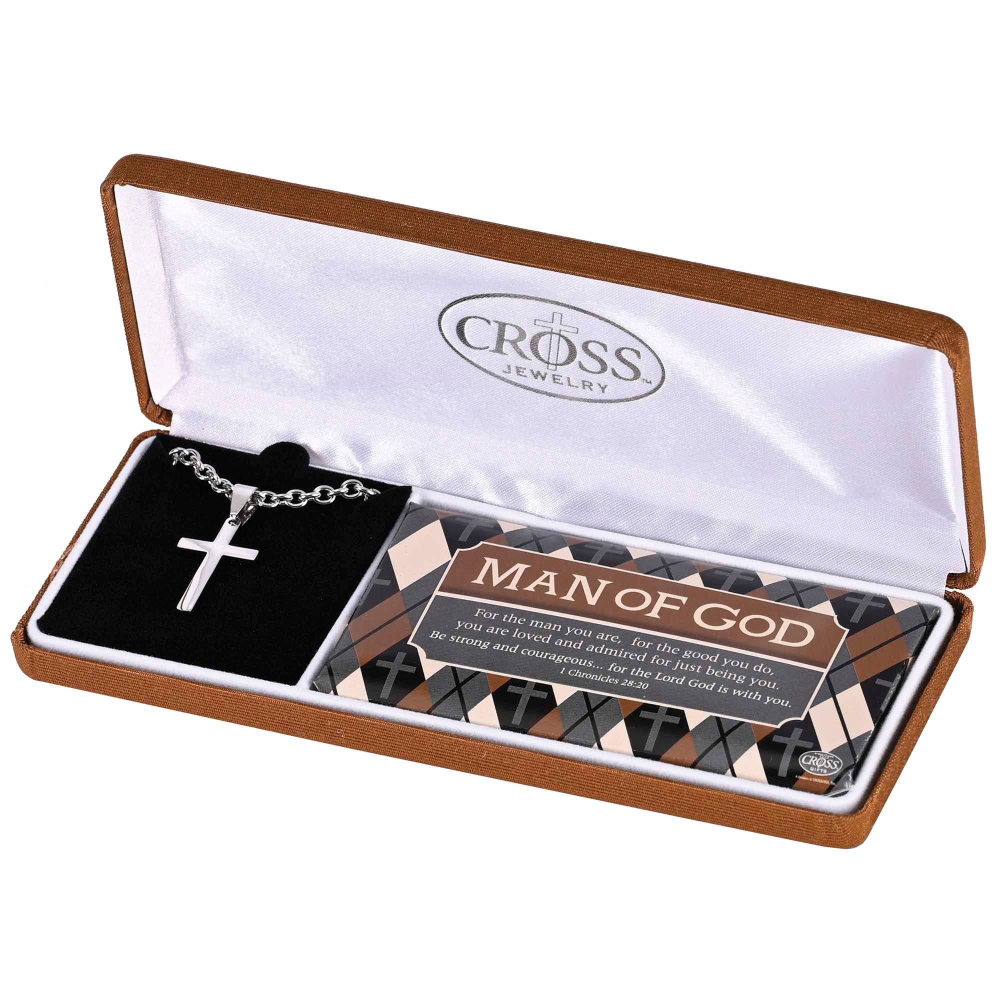 Men's Gold Tone Stainless Steel Nail Cross Necklace in Deluxe Gift Box with Joshua 1:9 Gold tone stainless steel nail cross has carved texture finish. Pendant is 1 1/4"L x 7/8"W with 3/8" bale on 24" gold tone curb chain. Comes in black fabric covered deluxe presentation gift box with attractive design and the words of Joshua 1:9, "Have I not commanded you? Be strong and of good courage, do not be dismayed, for the Lord your God is with you wherever you go."