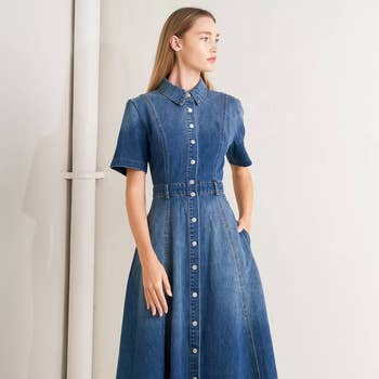 Button front short sleeved tiered denim maxi dress. This stylish dress features a button-down front, short sleeves, and a tiered skirt design that adds a touch of bohemian flair. The denim fabric provides a casual yet chic look, perfect for any season. Ideal for both day and night, it can be paired with sandals for a relaxed day out or dressed up with heels and accessories for an evening occasion. -Model is 5'9" and wearing a Small