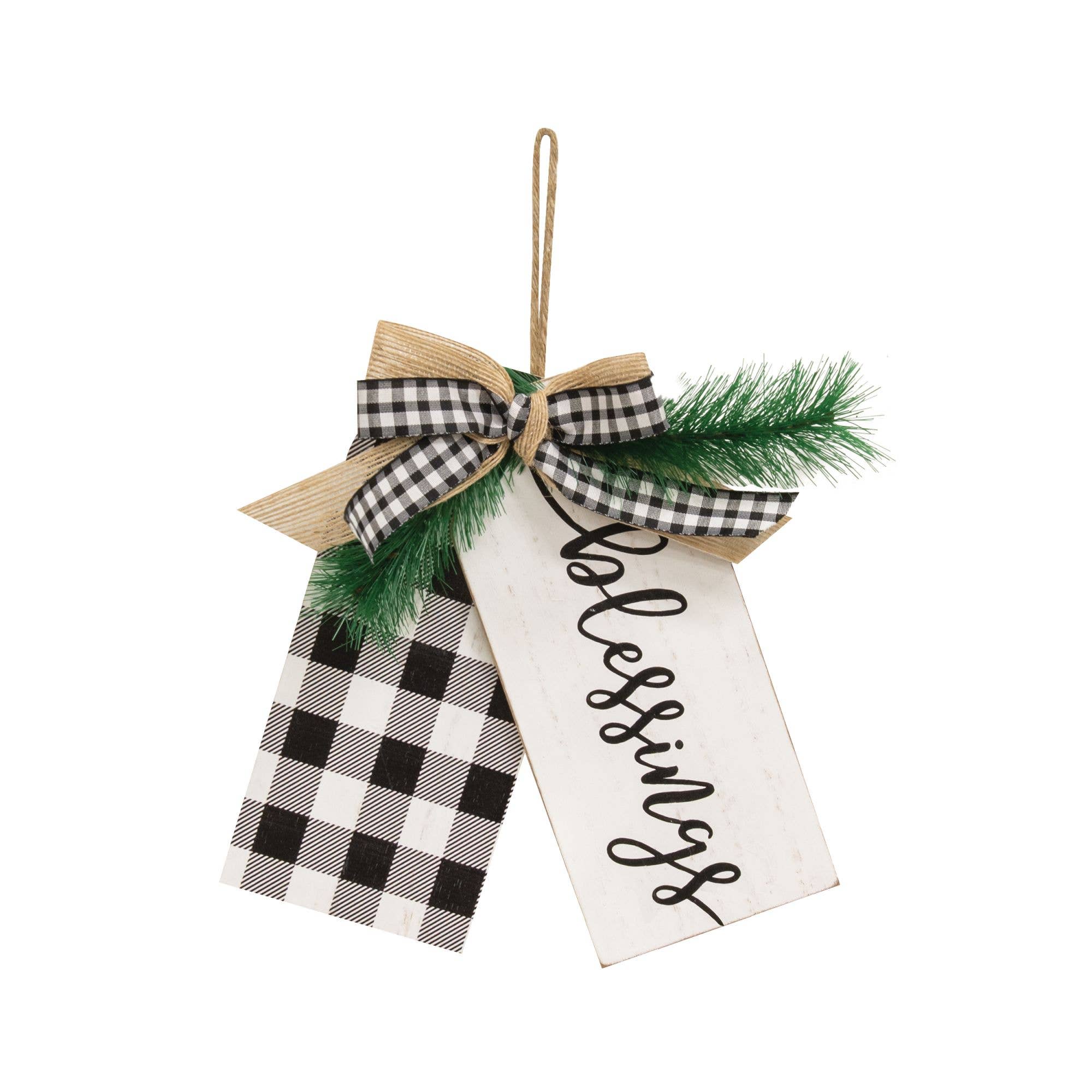 Beautiful white distressed wood ornament with light distressing. Black nail tacks and a black and white checked ribbon for hanging make this ornament a true treasure to share your faith on your Christmas tree.