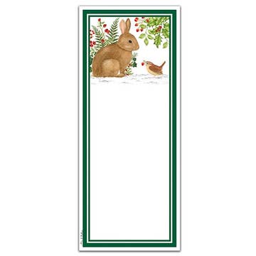 The Winter Wonderland Notepad depicts a holiday scene of a cardinal perched on a snowman's hand, along with the phrase "Winter Wonderland." The background features faint snowflakes, and the back has a magnet for easy hanging. The notepad has 50 sheets and measures 9-1/2" high by 2-3/4" wide.