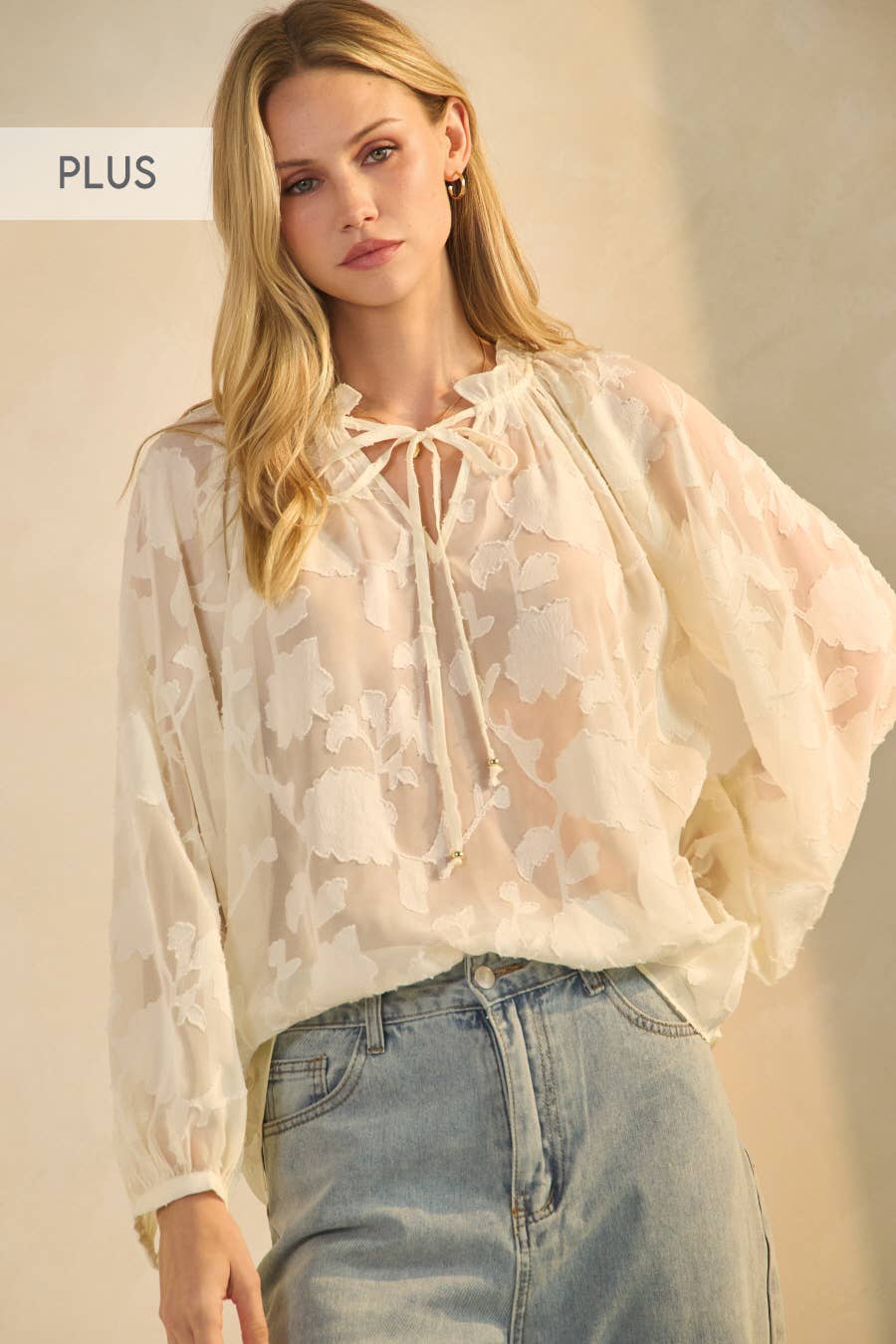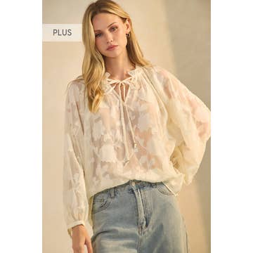 Back tie open back blouse in Satin snake jacquard fabric. This style features long balloon sleeves with elasticated cuff, elastic at waist, open back with multi tie closure, and a round neck.