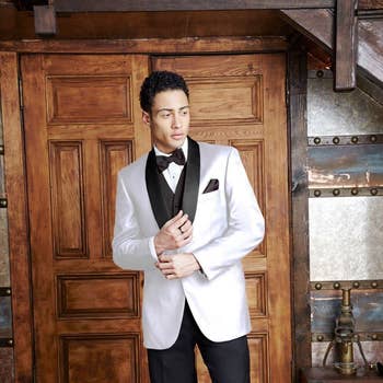 DETAILS The white color of the tuxedo gives a crisp and clean look. The lace detailing of the the tuxedo creates a soft and elegant look. Featuring a shawl lapel that adds the classic style that exudes sophistication. While the single button closure adds a modern twist to the traditional tuxedo. The suit consists of a tuxedo jacket and a pair of pants. Pants have an eight-inch difference between the chest and the waist. For example, if you choose a US38 size suit, your suit will come with 30-inch waist pants. SIZE + FIT Tailored fit, to find your correct size use the ''what's my size'' button. Ron Tomson suits and tuxedos are Drop 8, which means there is an eight-inch difference between the chest and the waist. COMPOSITION 67% Polyester, 33% Viscose Made in Turkey Style #16055 CARE Dry clean only This look featuring model Noah Steinbuch @noahsteinbuch wearing a size 40.