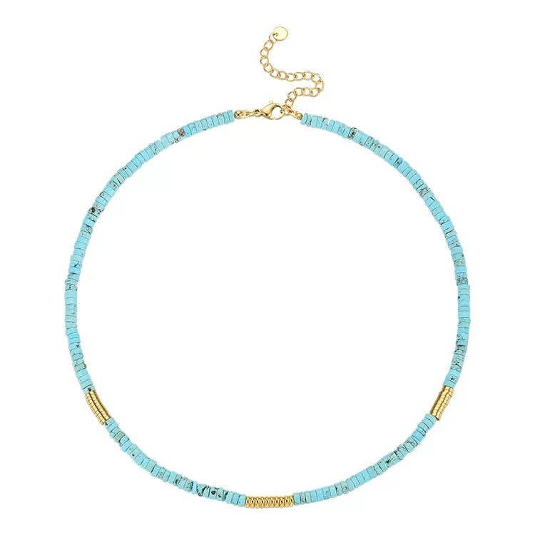 Navajo Beads Turquoise Stone Collar Necklace The Navajo Beads Turquoise Stone Collar Necklace is a beautiful and unique piece of jewelry that is inspired by traditional Navajo designs. The necklace features a collar design that is made of high-quality silver-tone metal, and is adorned with intricate Navajo-style beads and a large turquoise stone pendant. The necklace is adjustable for a perfect fit and has a lobster clasp closure. Lead compliant, Adult only.