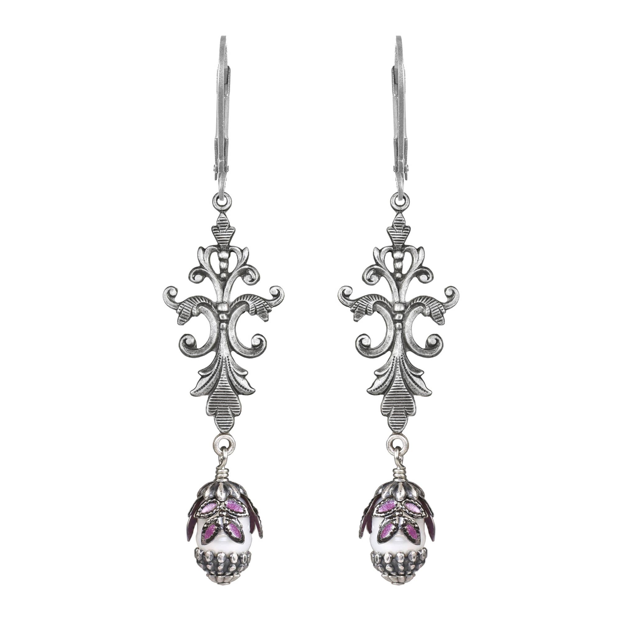 A tiny lattice floral connector connects a delicately carved shell or mother of pearl flower dangling underneath it. The connector has been either copper plated and given a verdigris finish, antiqued, or silver plated, which makes the details stand out. It made me think of a miniature Japanese garden, hence the name "Petite Garden." I offer these earrings in three variations, verdigris and blue, silver and cream, and gold and pink.