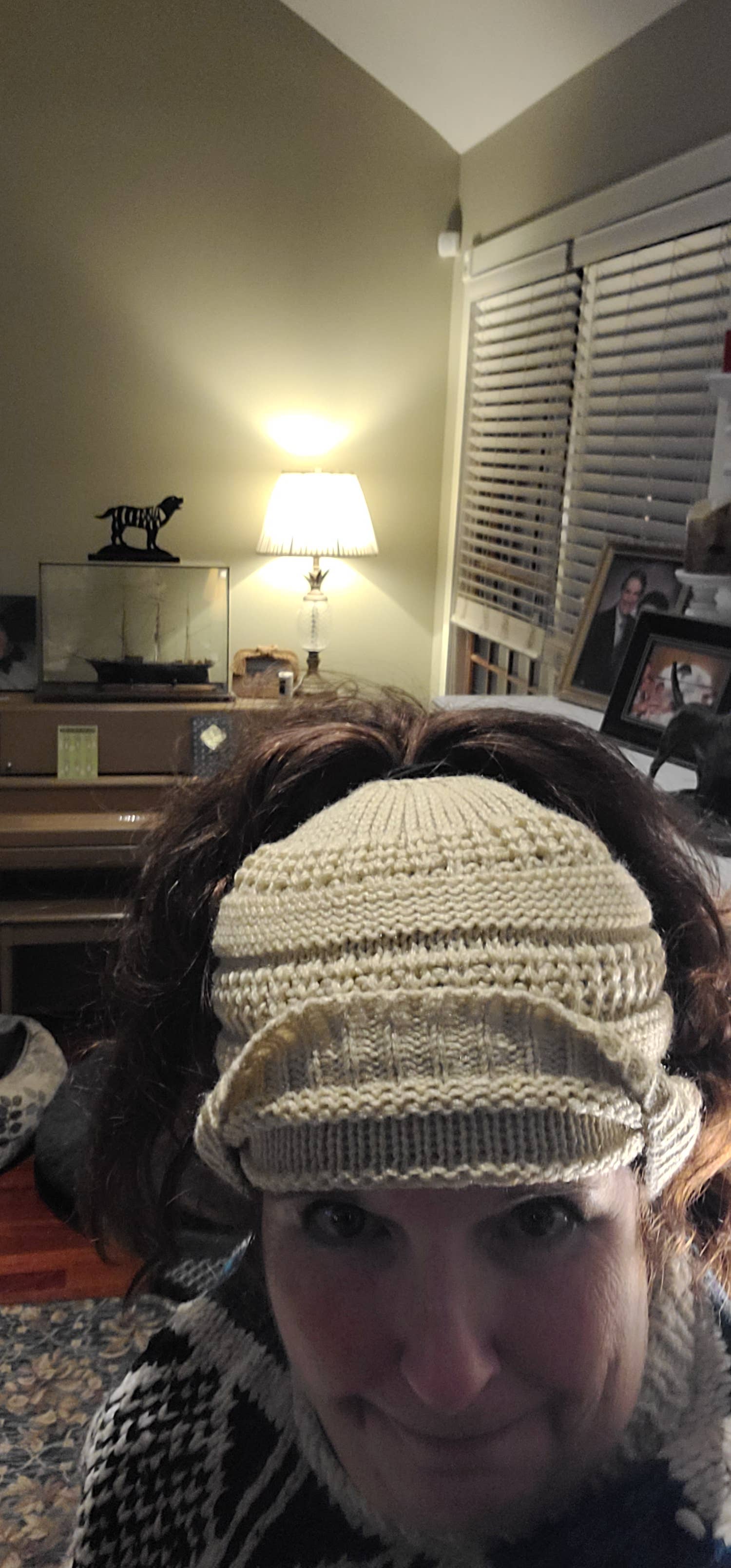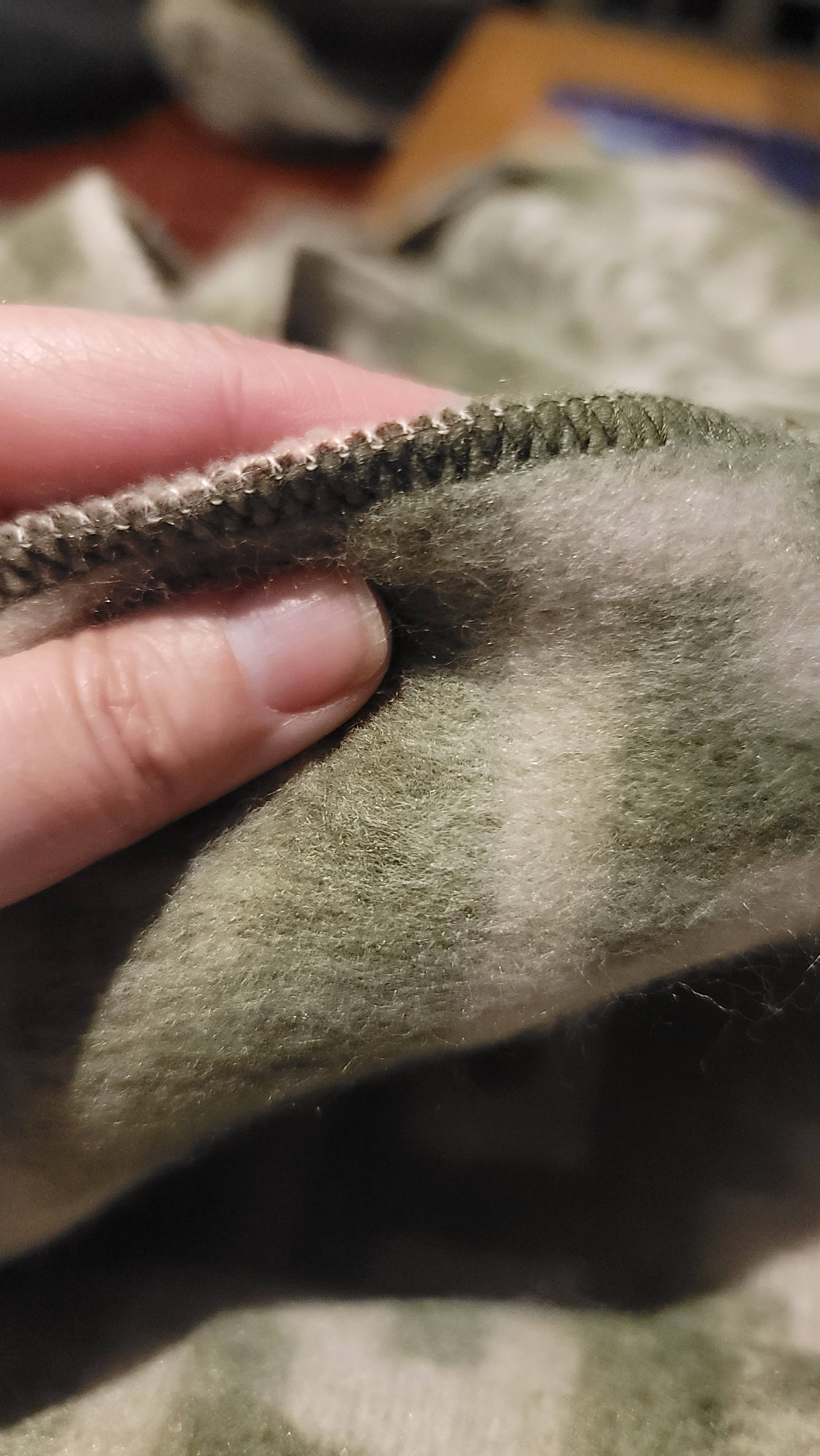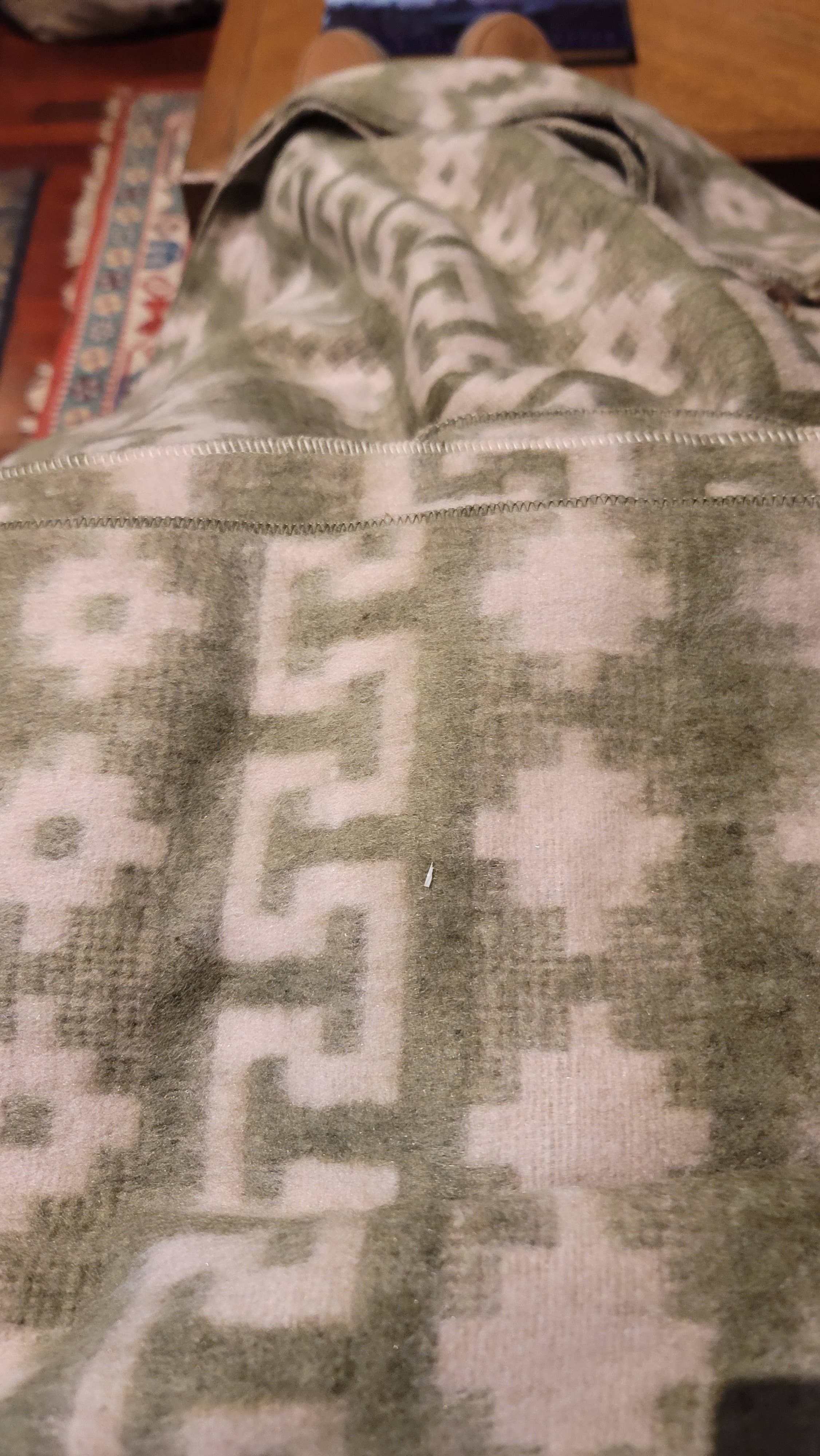 Love the blanket. Soft, thicker than I thought. Pattern is beautiful. The hole in the hat for the pony tail is a little large and is not as thick. The brown hat actually fits well and the socks are warm. Will star this seller as items are made well and are attractive.