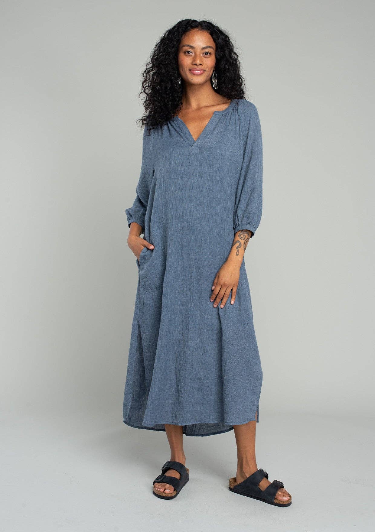 A loose-fit maxi dress featuring adjustable spaghetti straps, a scoop neckline with ruffle detail, a deep v-back detail with keyhole detail, and two side pockets. Perfect to be dressed up or down for the Summer months.