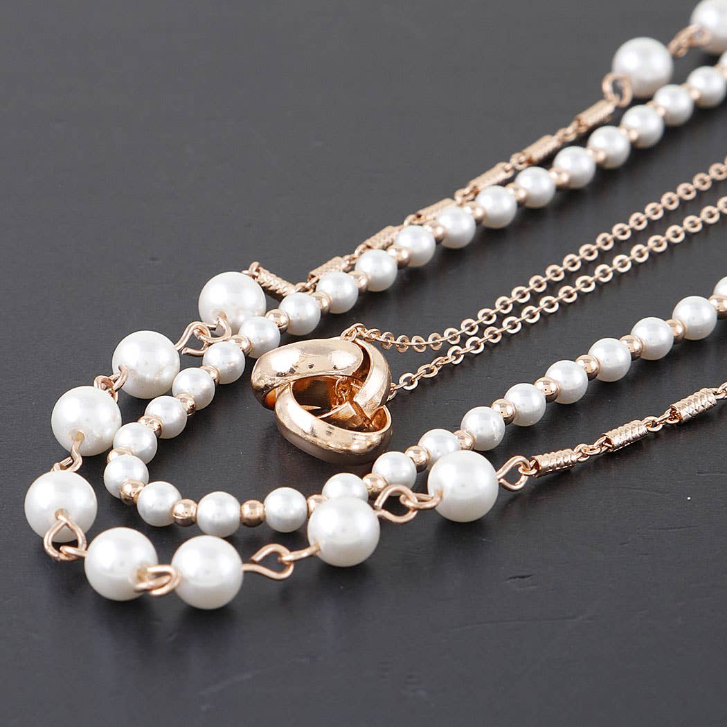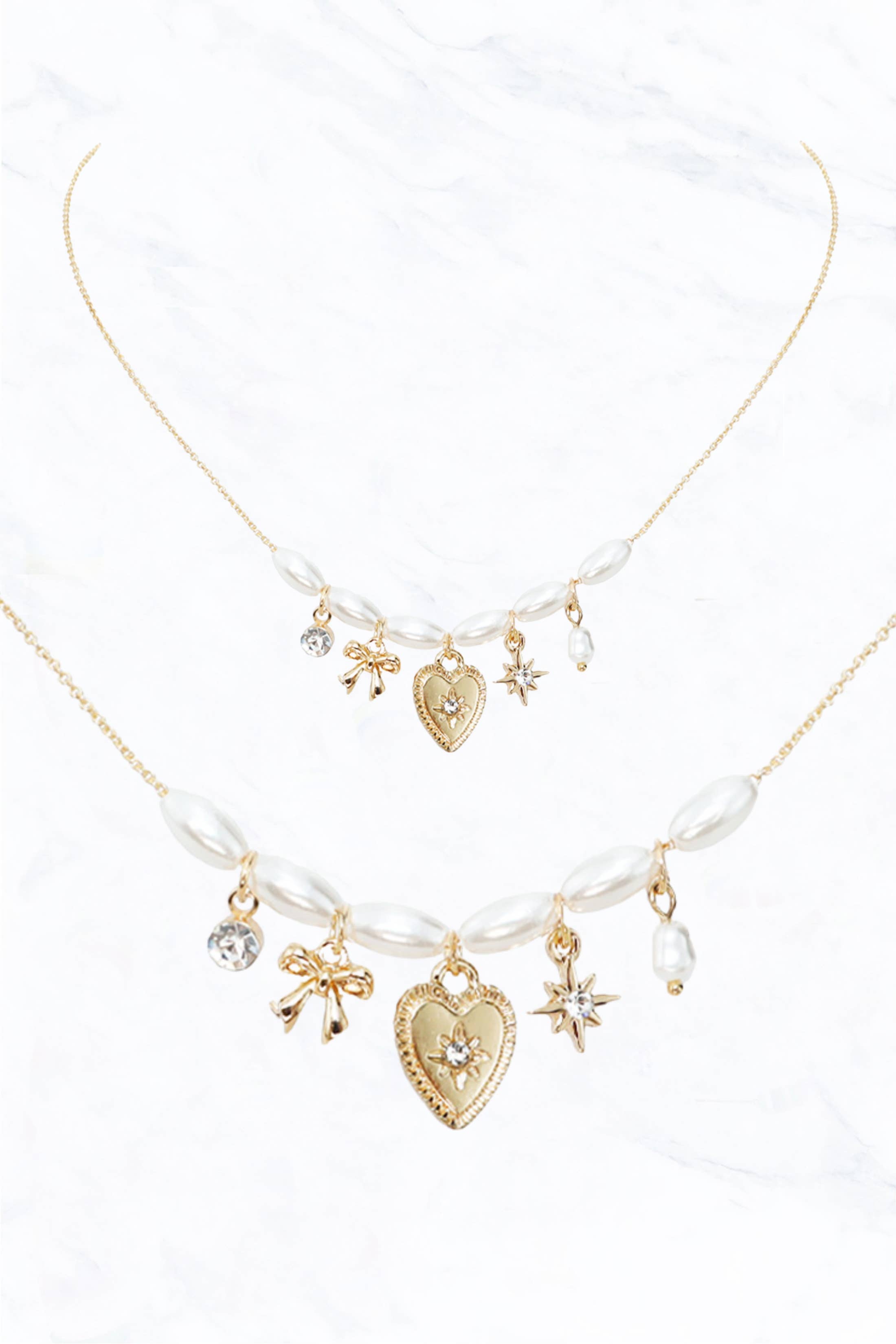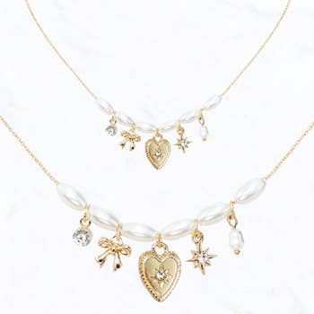 • Necklace Size : 14" + 3" L • Decor Size : 2.25" L • Elegant layered necklace featuring gold chains, pearl accents, and blue beads with assorted charms. A playful yet chic accessory perfect for adding a whimsical twist to casual or dressed-up outfits. • Lead and Nickel Compliant
