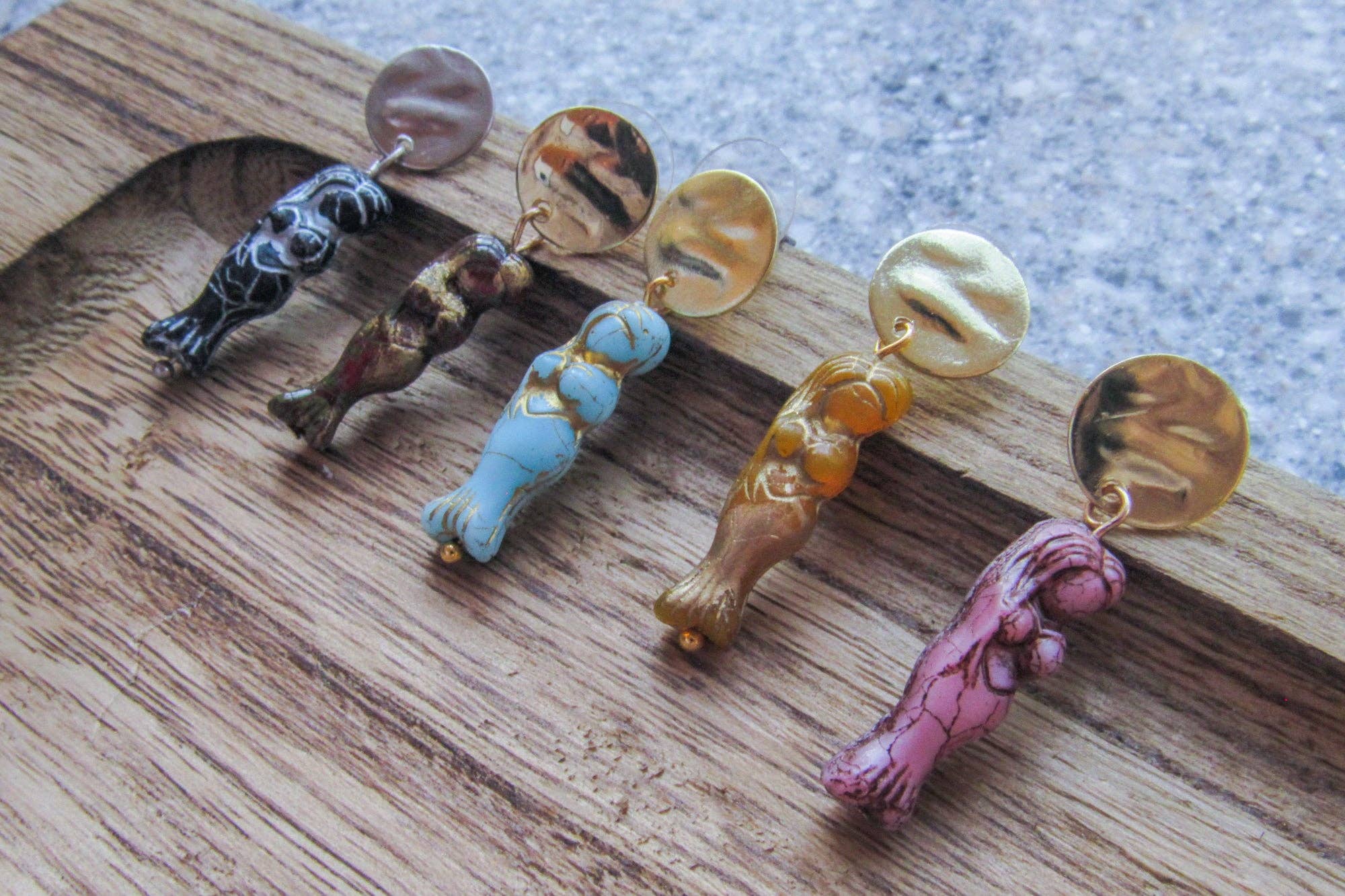 Polymer clay rainbow charms in natural colors. Round, wooden earring post with hand-painted gold foil added. Big Camping Gay Energy. Customize your order with hypoallergenic plastic earring components or turn into clip-on earrings for free. Featuring: * Polymer clay rainbow charms in natural colors * Round, wooden earring post with hand-painted gold foil added * Big Camping Gay Energy You can customize this design by choosing one of our hypoallergenic plastic earring components in place of the metal post. This way you can still add an extra bit of personality to your look without worrying about metal allergies or sensitive skin issues. Or, if you're looking for an alternative way to wear these earrings altogether, just let us know and we'll turn them into clip-on earrings for free—no additional charge.