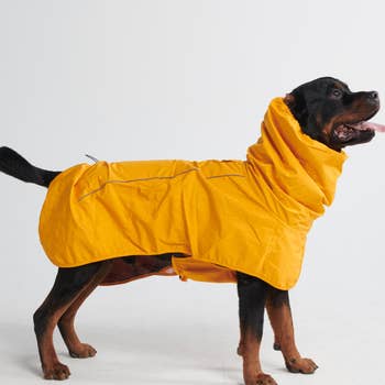 Our Slicker raincoats will have your pup happily splashing through puddles. Made of durable PU material, these raincoats are fun as well as functional. They feature a fashionable striped lining to keep your dog cozy and dry. Other features include a handy pocket on the back for keys or other small items and reflective striping on the pocket and hood to make sure your pup is noticeable, even in low light. These raincoats have a leash hole at the neck and an extra-wide closure along the belly to give your pup some room to grow. Available in: yellow, cobalt blue, and raspberry pink