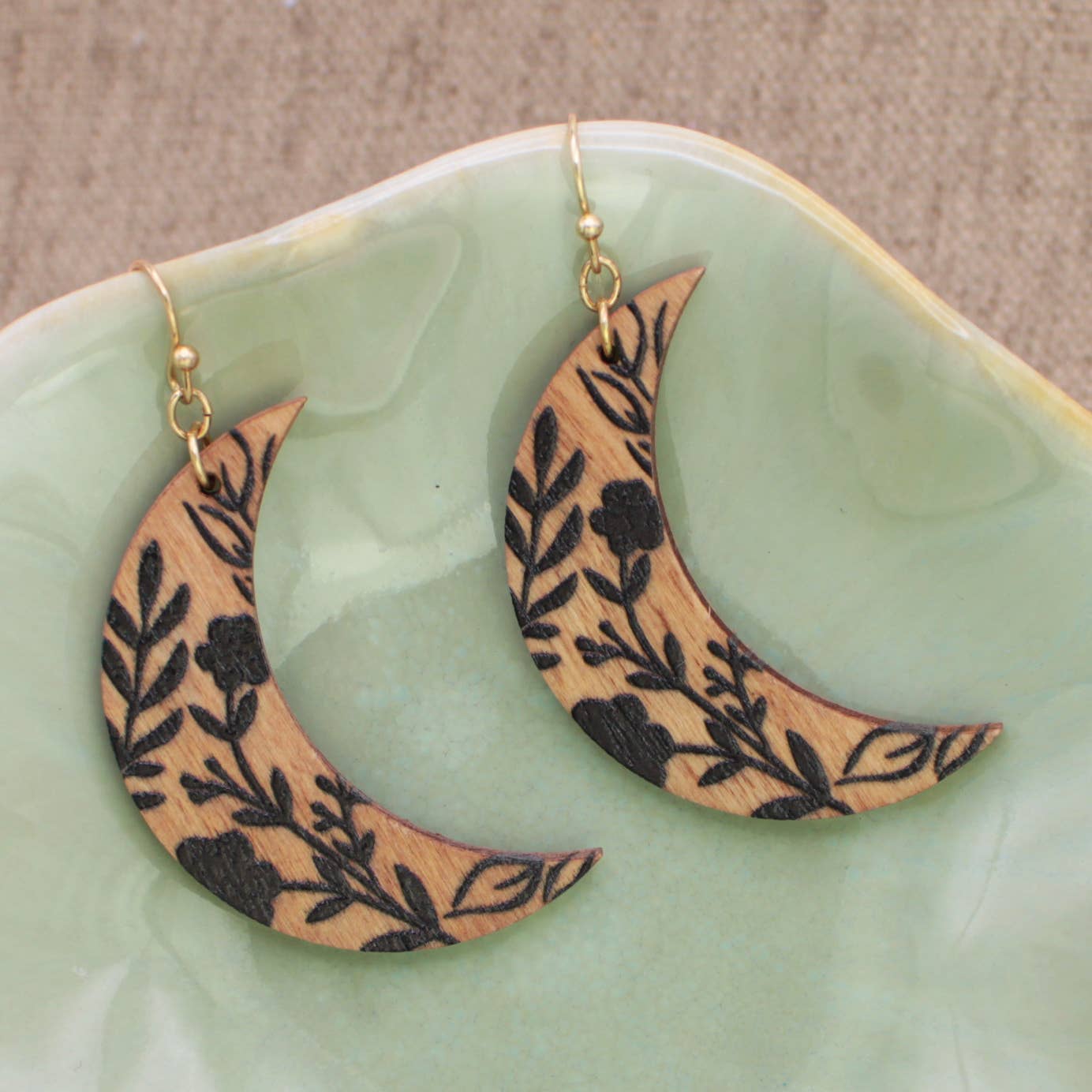 Forest green window teardrop shaped dangles. These are a top seller in our shop. They are 2 inches long and have details of little mushrooms, flowers, moss, vines, moon and stars.