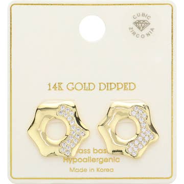This trending pair of earrings displays a fashionable gold dipped cubic zirconia pave pizza stud earrings style. Explore a refined sense of style with this trending pair of earrings, seamlessly elevating the chic factor of your look. MADE IN KOREA 80% BRASS 20% CUBIC ZIRCONIA