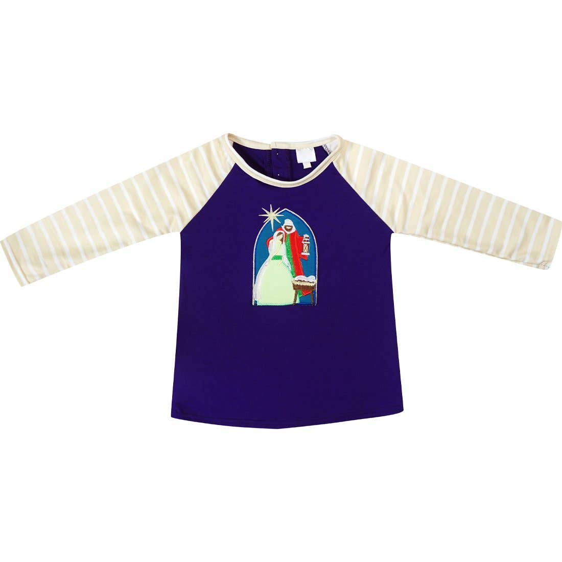2 piece set . The tunic top features Nativity Scene & Angels printing on the skirt and the 3 flowers on the waist adding charm to the top. This top is paired with beautiful bell bottoms. The season is bound to be merry and bright in this adorable and playful Christmas set! Play-ready comfort and festive charm unite in this coordinated set featuring Nativity Scene Angels print. A must-have for this Christmas and holiday season.