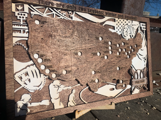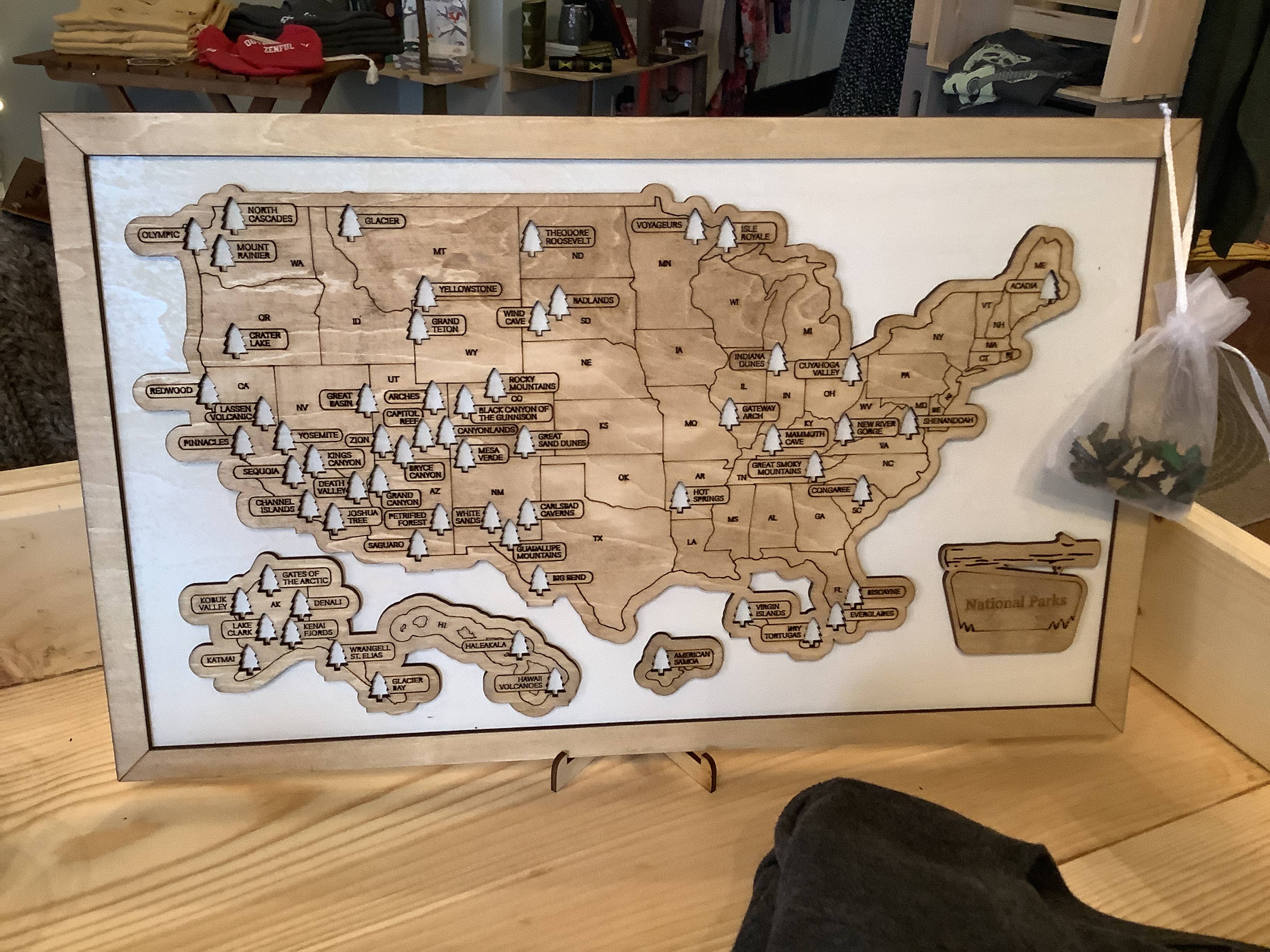 This National Park Travel Map can be used to record the parks you have visited - each park has a corresponding cutout green tree that you can proudly place on the map once you've visited the park. Traveling to all 63 National Parks is a popular lifetime goal among retirees, campers, and outdoor enthusiasts of all ages. These have been popular as wedding gifts, shower gifts, retirement gifts, and more. The neutral colors go well with a variety of home decor choices. Your map will come with a small stand to set it upright on a shelf, as well as a small bag filled with approximately 70 trees to place on the map as each National Park is visited. The map measures 10" tall by about 16.5" wide. This map is handcrafted in Wisconsin, USA.