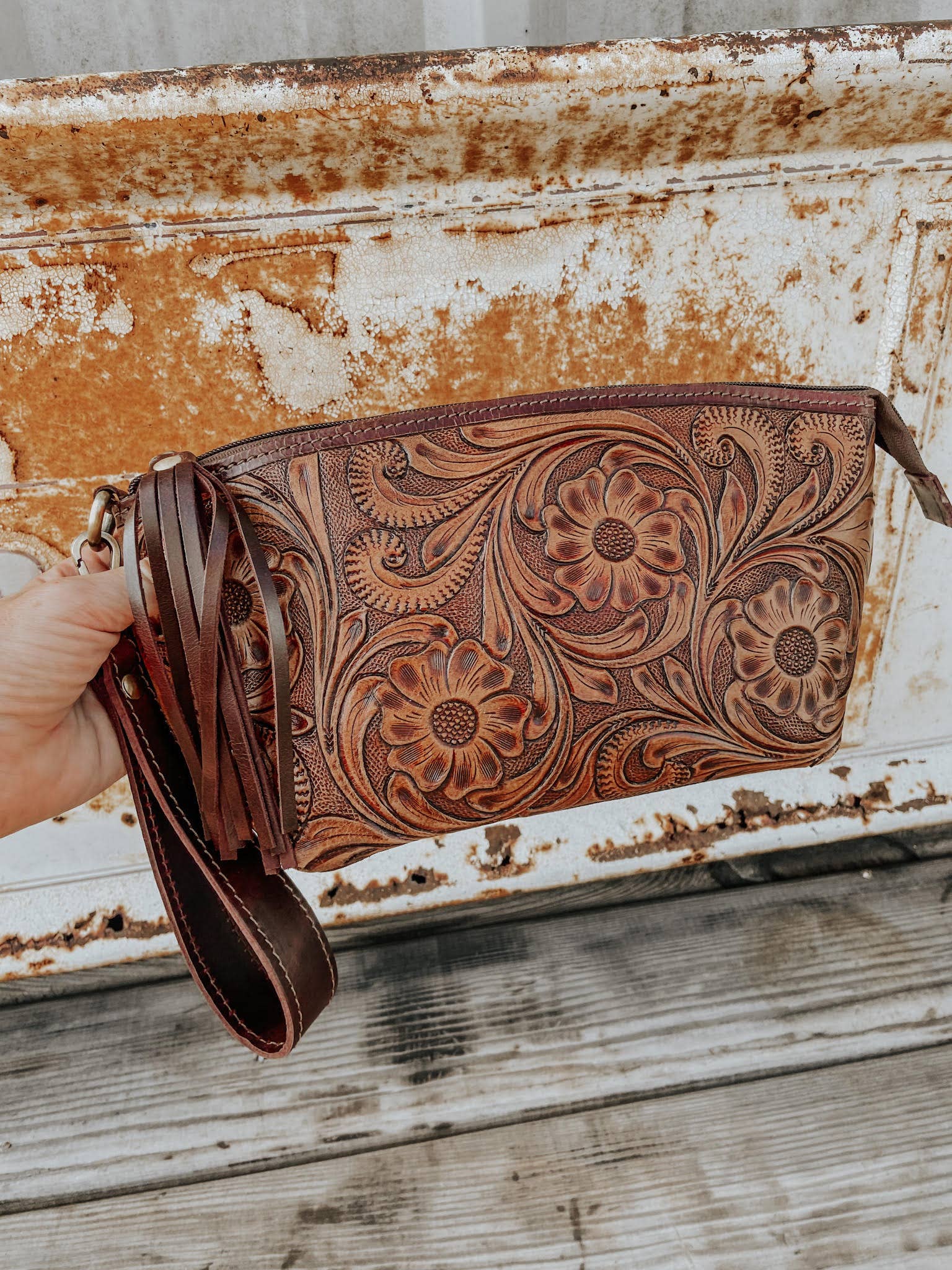BootStitch tooled leather & cowhide wristlet