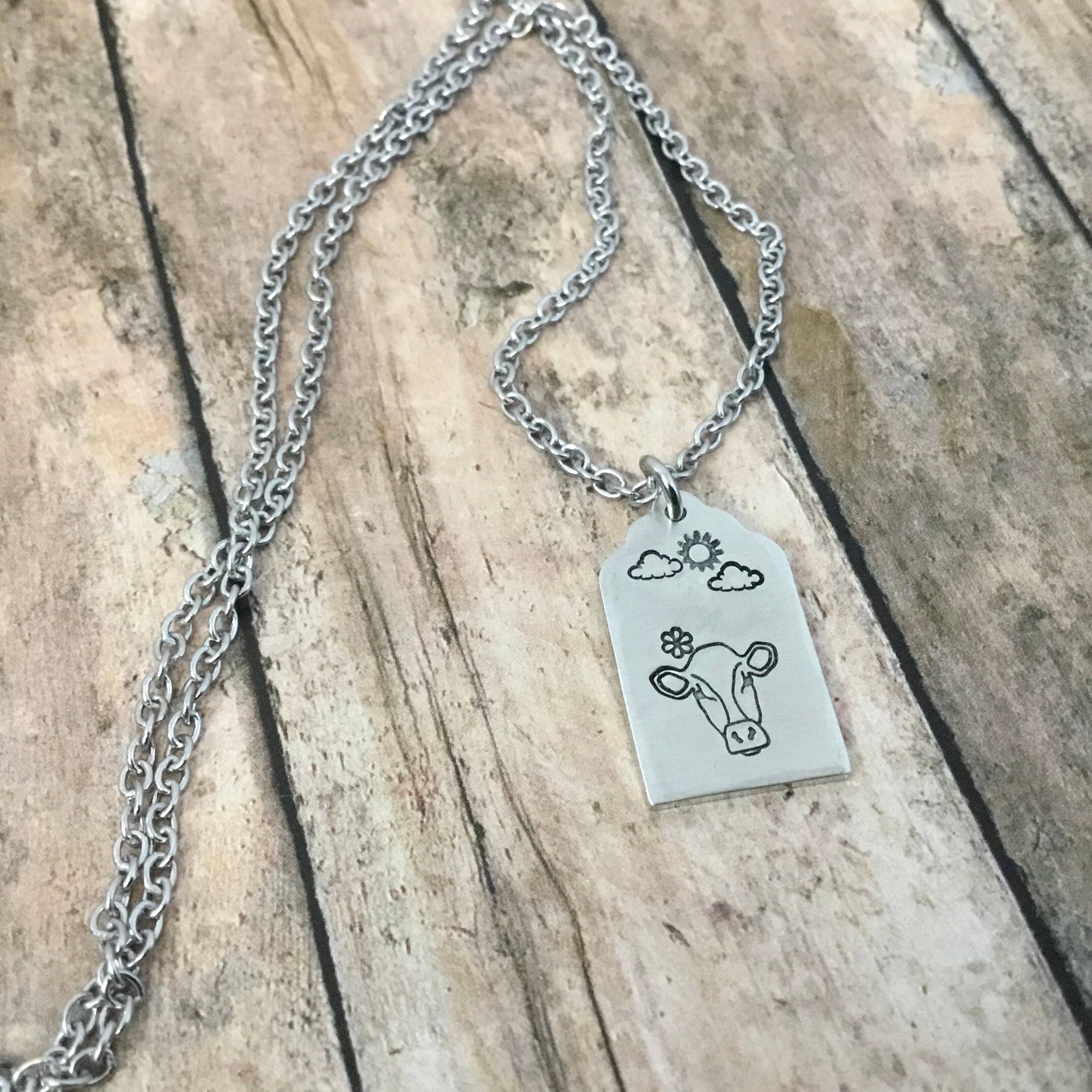 Cow on cloudy day, cattle ear tag style pendant