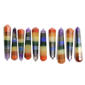 Mini sized durepox resin long magic wand with seven chakra aligned tumbled stones and crystals. Chakras are vortexes of energy residing across different points on our spinal column. The 7 chakras are connected to different glands and organs in the body, each represented by a different color of the rainbow, and are responsible for distribution of “Chi” or life energy through them. • Item code: MN-7 • Each of the 7 stones represent a chakra. • Ideal for reiki healing, energy healing, or room decor. • Realign your chakra energy with this spiritual piece. • Materials: Stone, Quartz Crystal, Resin • Handmade in Peru.