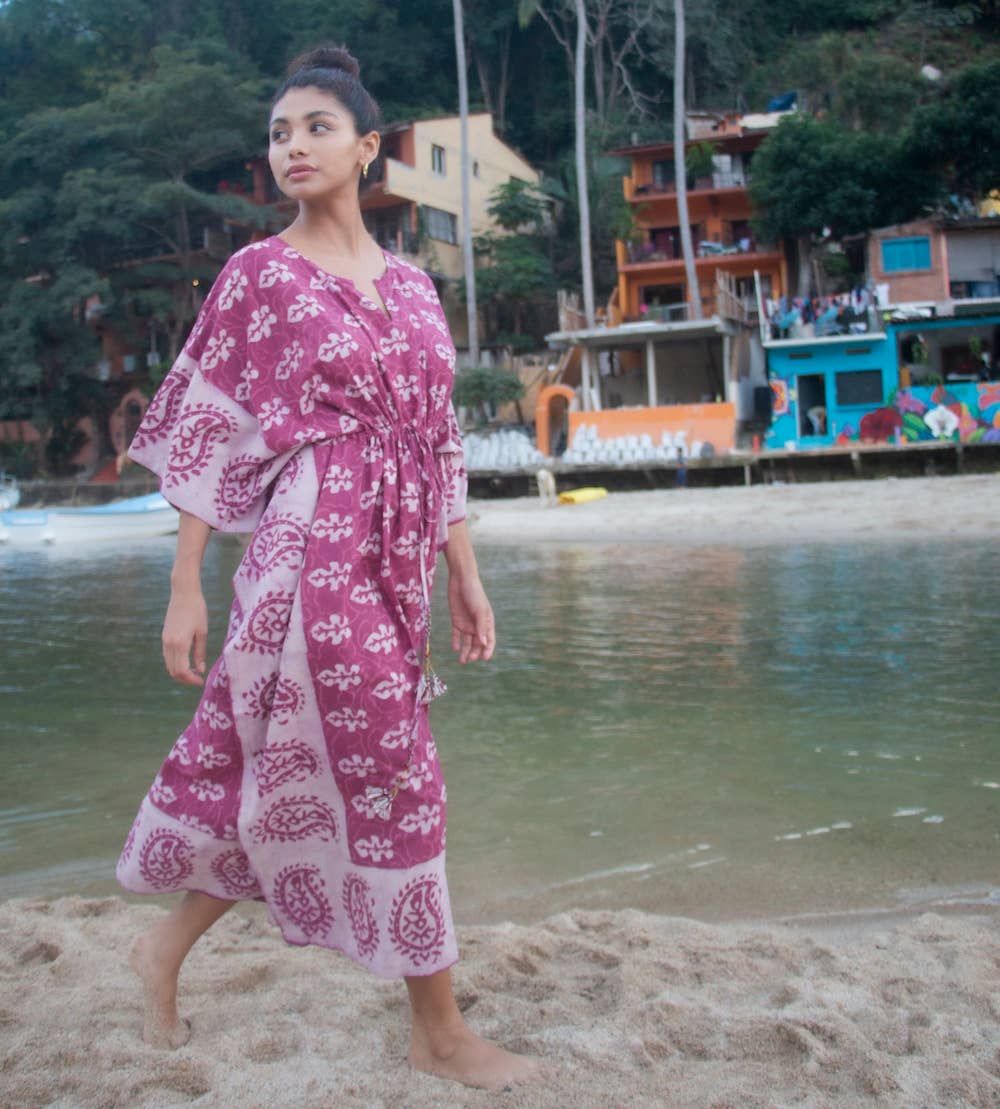 Our Anjali Block Print Caftans are hand block-printed on soft 100% cotton material by artisans in Rajasthan, India. The wooden blocks are first hand-carved and the design is then hand-stamped using a different block for each color in the pattern. The seamless printing shows the fine skill of the block-printers, and it is a craft that has been passed down from generation to generation. • These fine cotton caftans are designed for an elegant, comfortable fit and feature a drawstring waist and contrast print on the neckline and borders. • Matching sarongs are also available in these beautiful block print designs. • One size fits most. ---------------------------- • Care: Machine Wash in Cold Water, Tumble Dry Low Heat Bust: 48 inches around (122 centimeters) Length: 50 inches (127 centimeters) ----------------------------