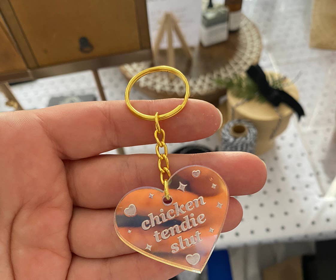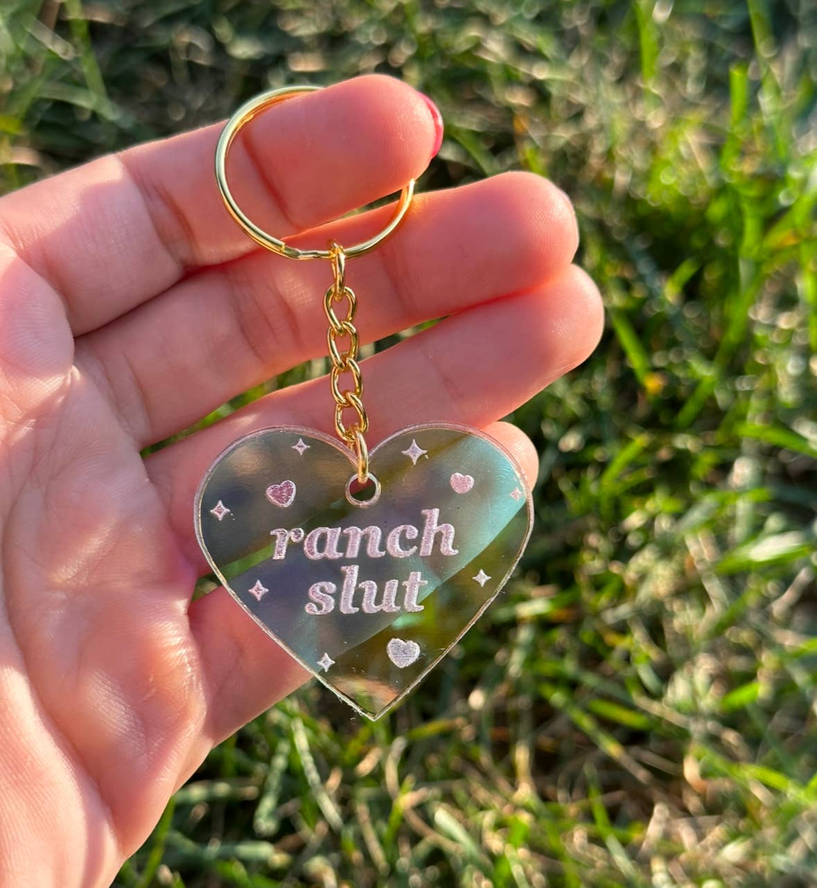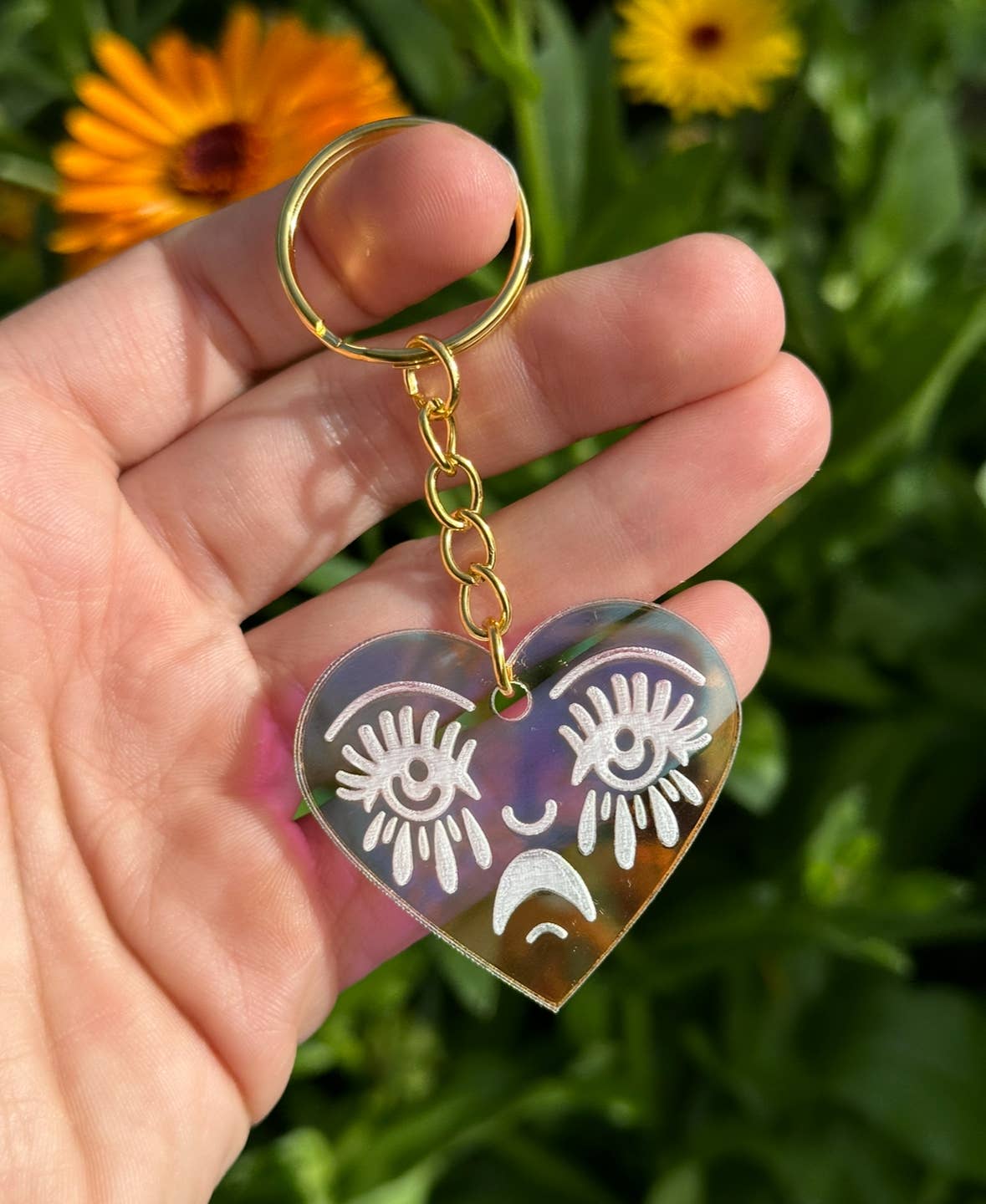 This keychain is 1.5 inches in height. It is made by and designed by Jenny Shlemon in iridescent acrylic. The iridescent acrylic is a color shift acrylic that is translucent and very eye catching. It’s super lightweight and very adorable. It makes a great gift. The chain is golden.