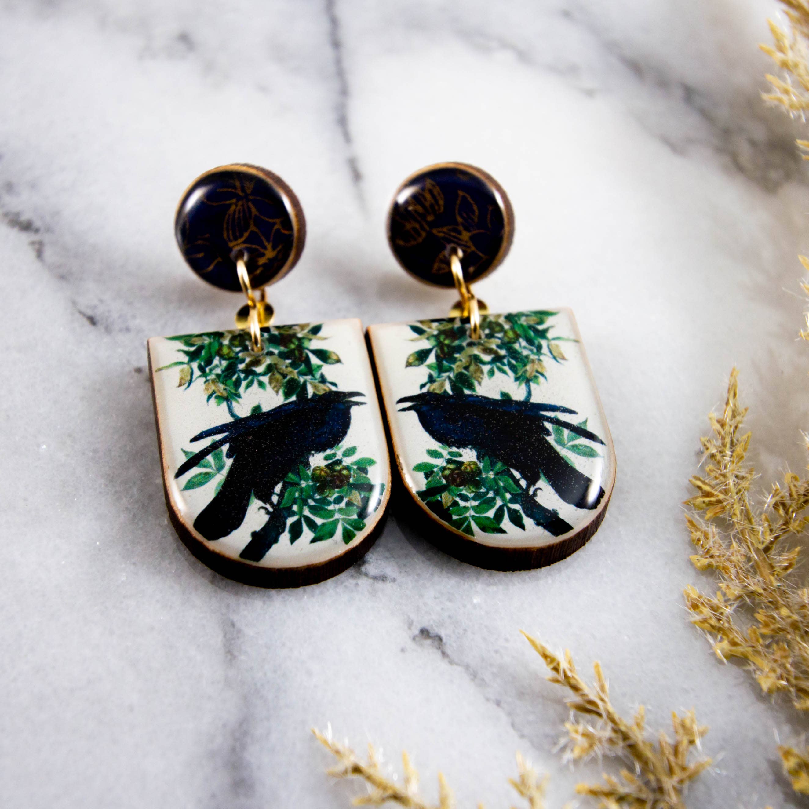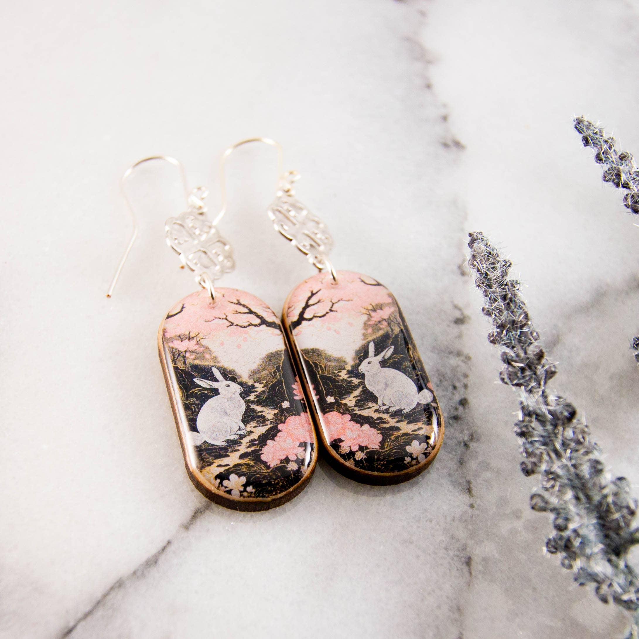 These charming earrings are the perfect celebration of spring! Featuring a vintage inspired rabbit illustration, rendered in soft pink, white, and black. Made from sustainably sourced North American hardwood and finished with soy-based, BPA/VOC free resin, these vibrant earrings will bring joy and brightness to any wardrobe. Handcrafted sterling silver ear wires. Silver plated medallion detail. Approximately 2.25 inches long.