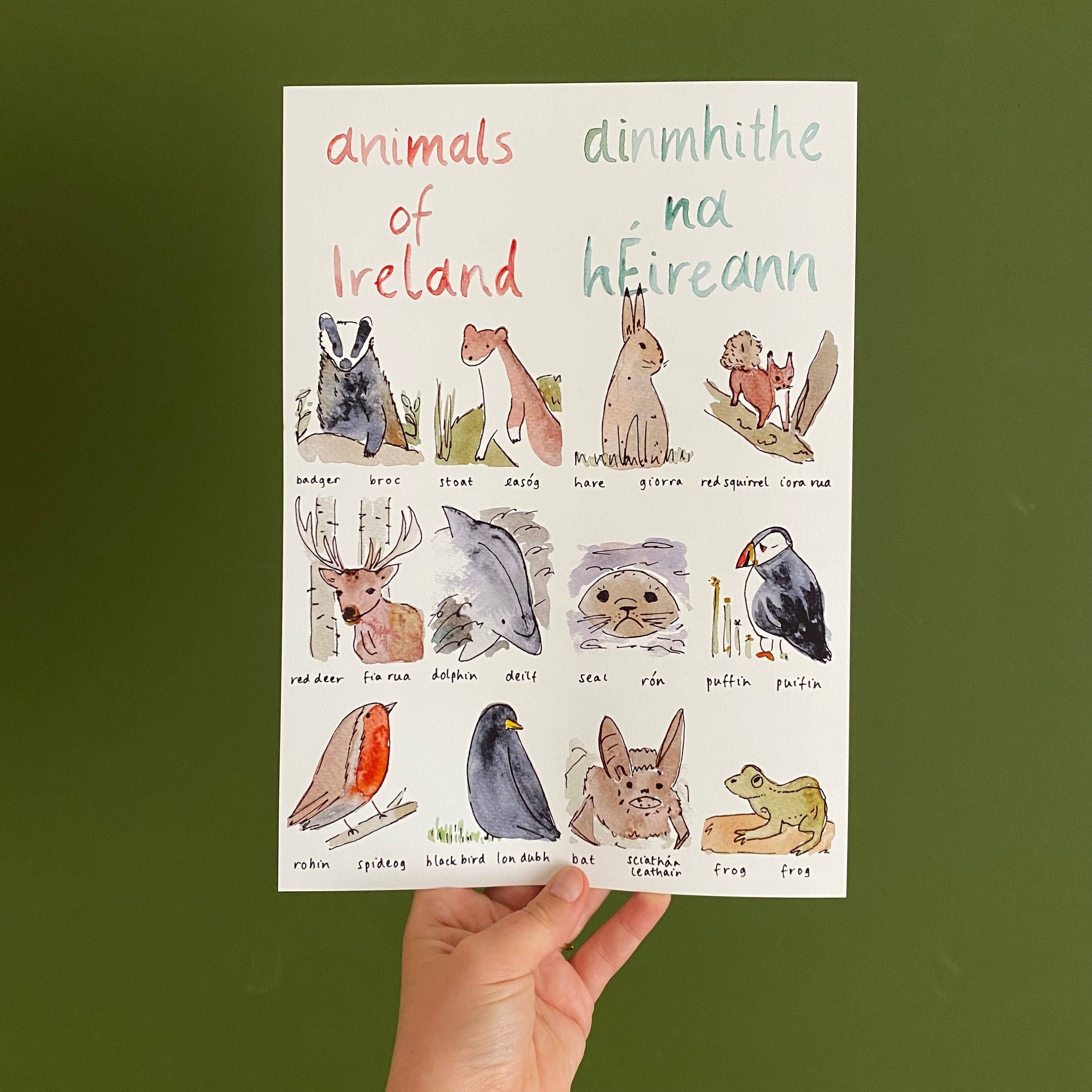 Decorate your child's playroom or nursery with this fun A4 art print in English and Irish. This print makes a lovely gift for a new baby or a child's birthday, and should hopefully get them excited about eating their greens. Alternatively, it makes for great decor for a kitchen! These prints are handmade in my home studio in Dublin, Ireland. I was inspired to make the original watercolour illustrations for my own daughter's room to help her learn her first words in English and Irish. My friends and family loved them so much that I decided to make my own prints so I could share them with the world. These posters are printed on high quality matte archival paper, which means they'll last without fading for many years. The prints are A4 and come unframed. Product Name: A4 Irish print – Fruits & Vegetables – Torthaí agus Glasraí – Gaeilge, Irish, Nursery Wall Art, Gift for Baby, Gallery Wall, Christmas Gift