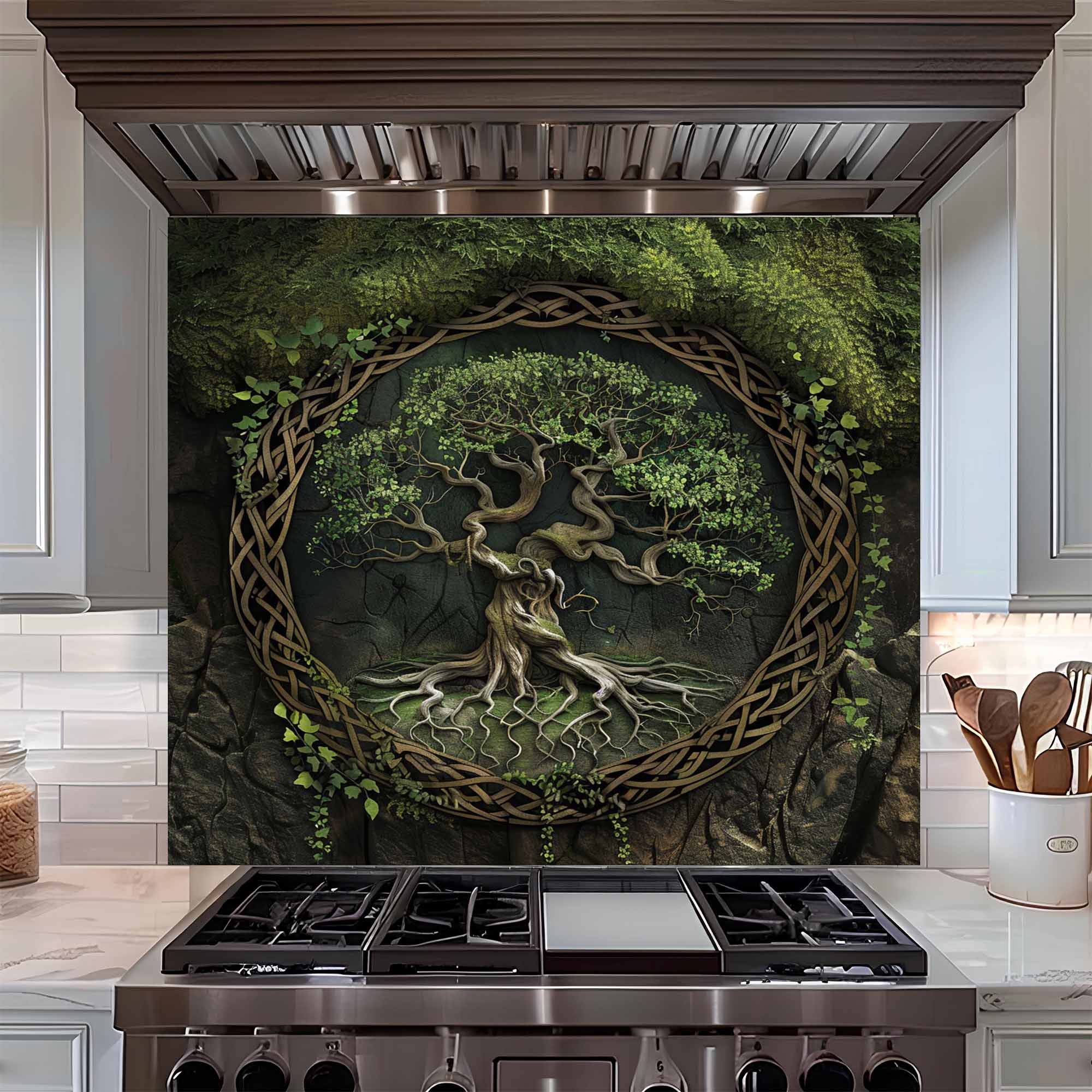 CELTIC MOUNTAIN TREE The Celtic Mountain Tree tempered glass backsplash features a majestic tree entwined with ancient Celtic motifs, rising from a rocky mountain base and reaching into the vibrant green skies. A symbolic addition to any kitchen seeking strength, grounding, and nature's calm energy. WHY CHOOSE THIS TEMPERED GLASS BACKSPLASH? * Nature-inspired glass backsplash with Celtic heritage * Perfect tempered glass backsplash for kitchen tranquility * Ideal back splashes for kitchen walls with mountain aesthetics * Stove backsplash that tells a story of strength and roots PRODUCT FEATURES * 6 mm thick tempered glass – heat and moisture resistant * UV-printed artwork sealed beneath glossy surface * Effortless to clean and maintain – no grout needed * Suitable as stove backsplash or decorative wall piece CUSTOMIZABLE DESIGNS This design can be adjusted in both size and layout. Looking for a custom forest scene or tree design? We accept custom requests for all tempered glass backsplash for kitchen orders. AVAILABLE MOUNTING OPTIONS * Stick (double-sided industrial tape) * Adhere (neutral silicone application) * Stick + Adhere combo (for ultimate hold) * Screw (ask for pre-drilled holes) ESTIMATED SHIPPING TIME * USA & Canada: 2–7 business days delivery * Packaged securely to prevent damage CUSTOMER SERVICE QUALITY Order and relax – your tempered glass backsplash for stove will be delivered safely. If you need assistance, our support is always here to help.