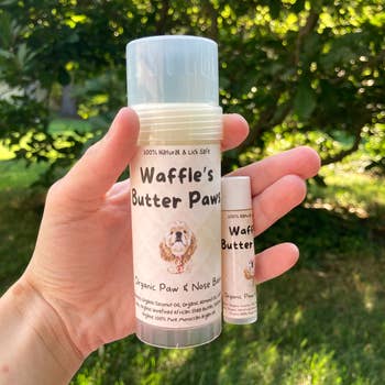 A handcrafted paw balm that moisturizes, protects, and conditions dry, cracked paws. It can be used on any type of paw or skin and is safe for human use. The product is not greasy and has a pleasant natural scent. Ingredients: Locally sourced Beeswax, Organic Coconut Oil, Organic Olive Oil, Organic Shea Butter, Organic Castor Oil