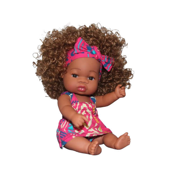 A high quality realistic Afro Caribbean doll Made of high quality silicone, non-toxic and anti-allergenic for children, eco-friendly, the doll is smooth and soft to the touch. The eyes are made of acrylic and the hair is implanted by hand. The joints of the arms, legs and head can rotate 360°. The doll measures 32cm from the base of the skull to the toes. She has long lashes, a light makeup, finely drawn eyebrows, and an adorable navel (and even a “whip”, like that no doubt, it's a girl!). All these details make it look much more like a real little girl than most dolls/dolls you find in store. The doll complies with CE standards, so safe for children. Clothing in African wax, sewn by a craftsman couturier from Togo The clothes are sewn by Afrowax Empire, a micro-company partner of our project.
