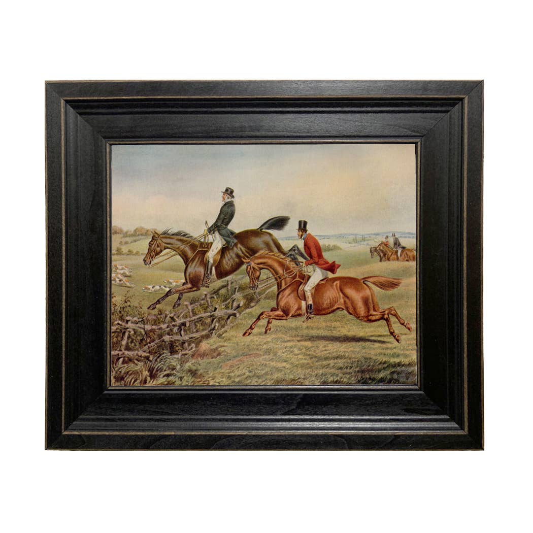 Begun in 1696, The Quorn Hunt is notably one of the world's oldest fox hunts. This framed print is perfect equestrian or English country decor, and a great addition to a gallery wall. This panoramic landscape is a reproduction print of the original painting by English painter John Ferneley Sr. (1781-1860). The image is printed on canvas, mounted to a board and treated with an historic looking varnish. Framed in an elegant 3/4" gold and black resin frame, the back is finished with 100% recycled craft paper and a wire hanger. • Framed size: 17-1/2" x 7-1/2" • Frame depth: 1"