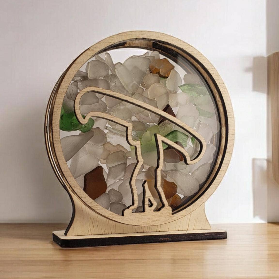 Showcase your sea glass and shark teeth with this small round shadowbox featuring a bold shark design. The sleek, circular frame highlights your ocean treasures, adding a touch of adventure and marine spirit to any space. Perfect for shark enthusiasts and beachcombers, this shadowbox brings the thrill of the sea into your home. Choose from 4 display styles: *Single Sided with wood back *Double sided with clear acrylic back *Window Hanging with included suction cup *LED Night Light base with Remote control Choose from 13 different color options. The face plate will be dyed the color of your choosing. The double sided Display and LED Night Light versions will be dyed on the front and back. The single sided and window hanging versions will be dyed on the front only. The opening to add your beach glass pieces measures approximately 0.75in x 0.5 in. Comes individually boxed. 5.5 x 5 x 1.75. Sea Glass Not Included.