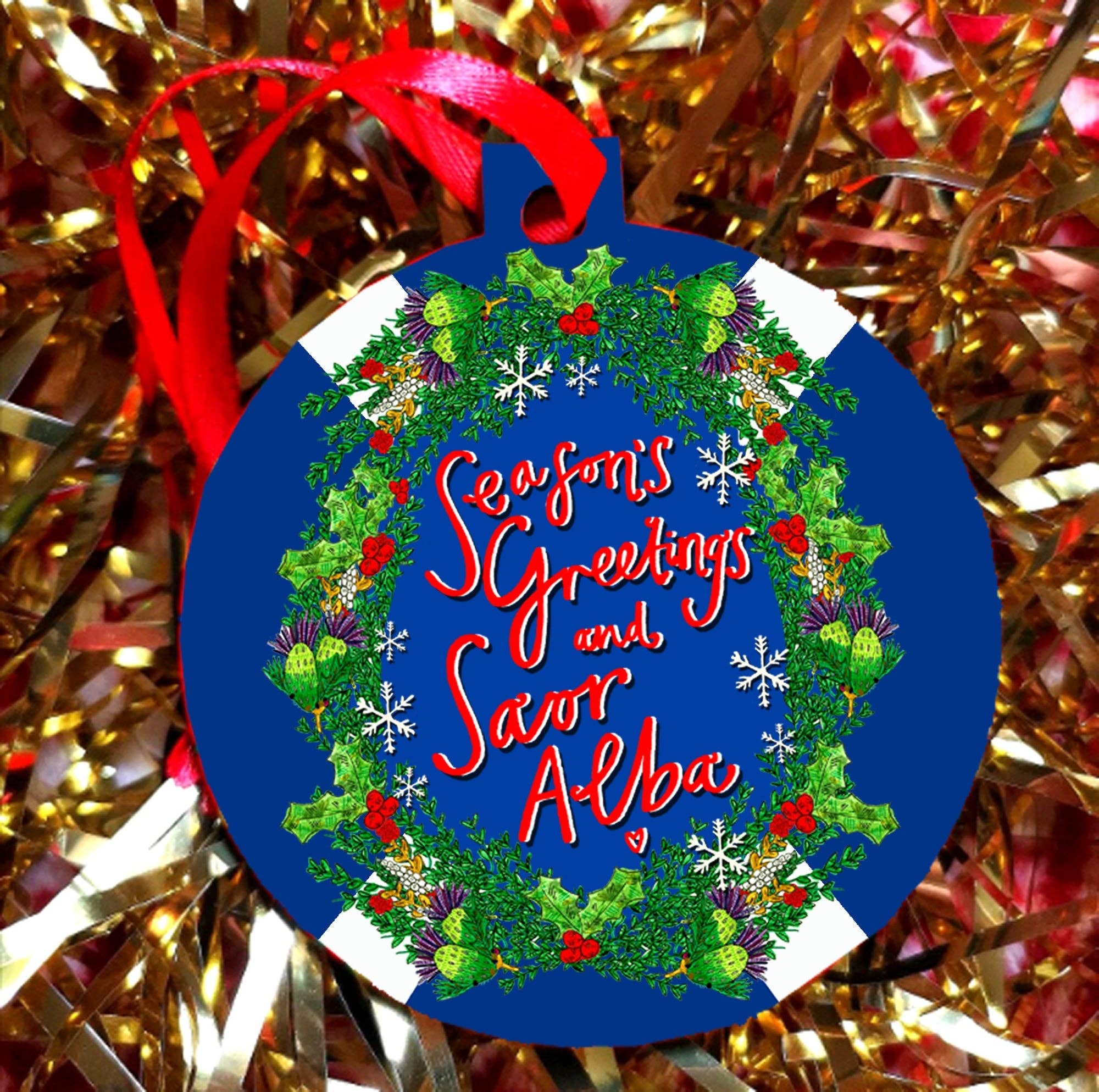 'Have a Pure Dead Brilliant!' Xmas tree decoration, a classic Scottish saying and perfect addition to the tree. Sublimation printed decoration, decoration size is 7cm x 7cm. Decoration comes on a red ribbon. RRP £7.00 each
