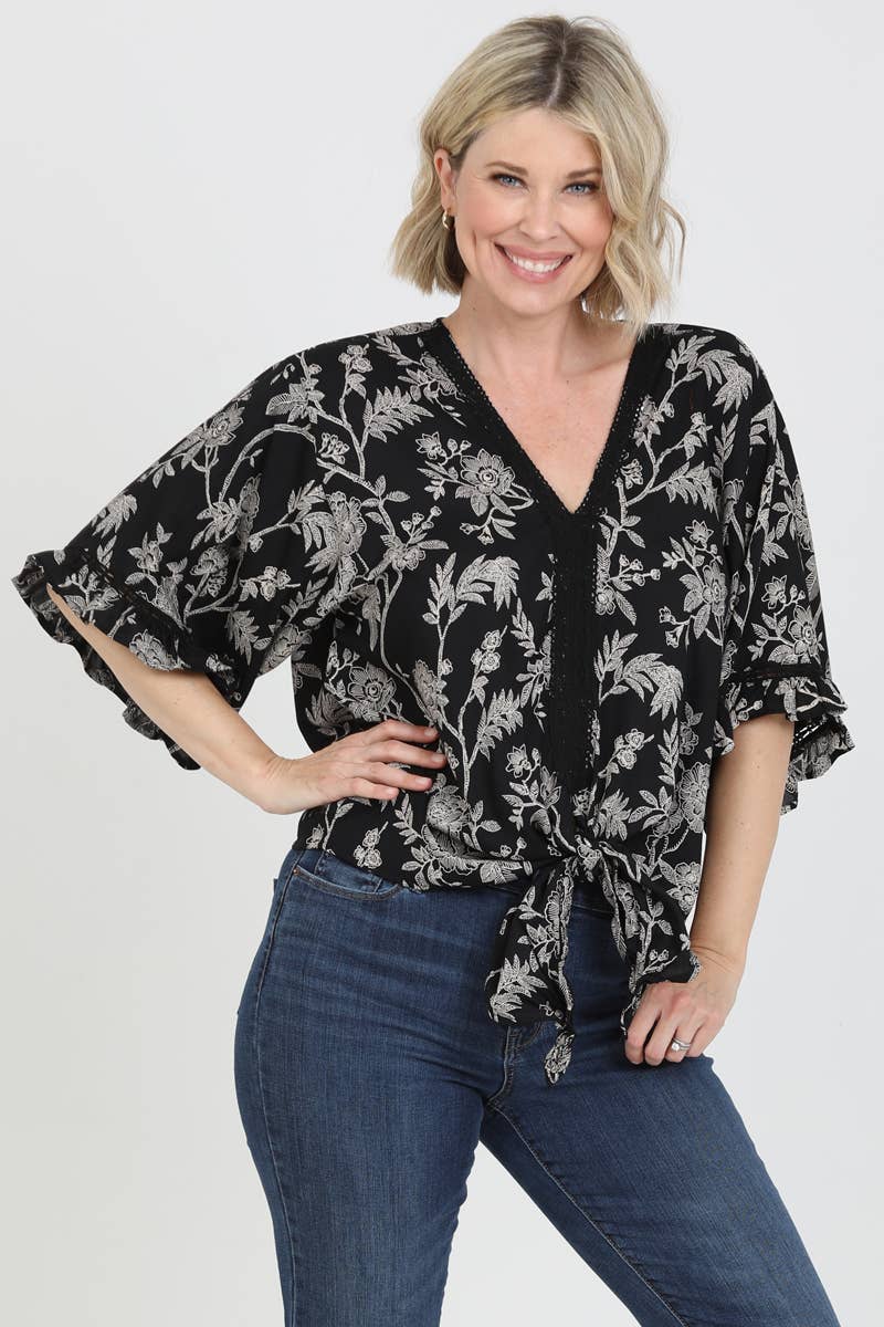 Plus Mesh Printed Henley Necked Half Placket Blouse with 3/4 Sleeves, Buttons, and Pocket.