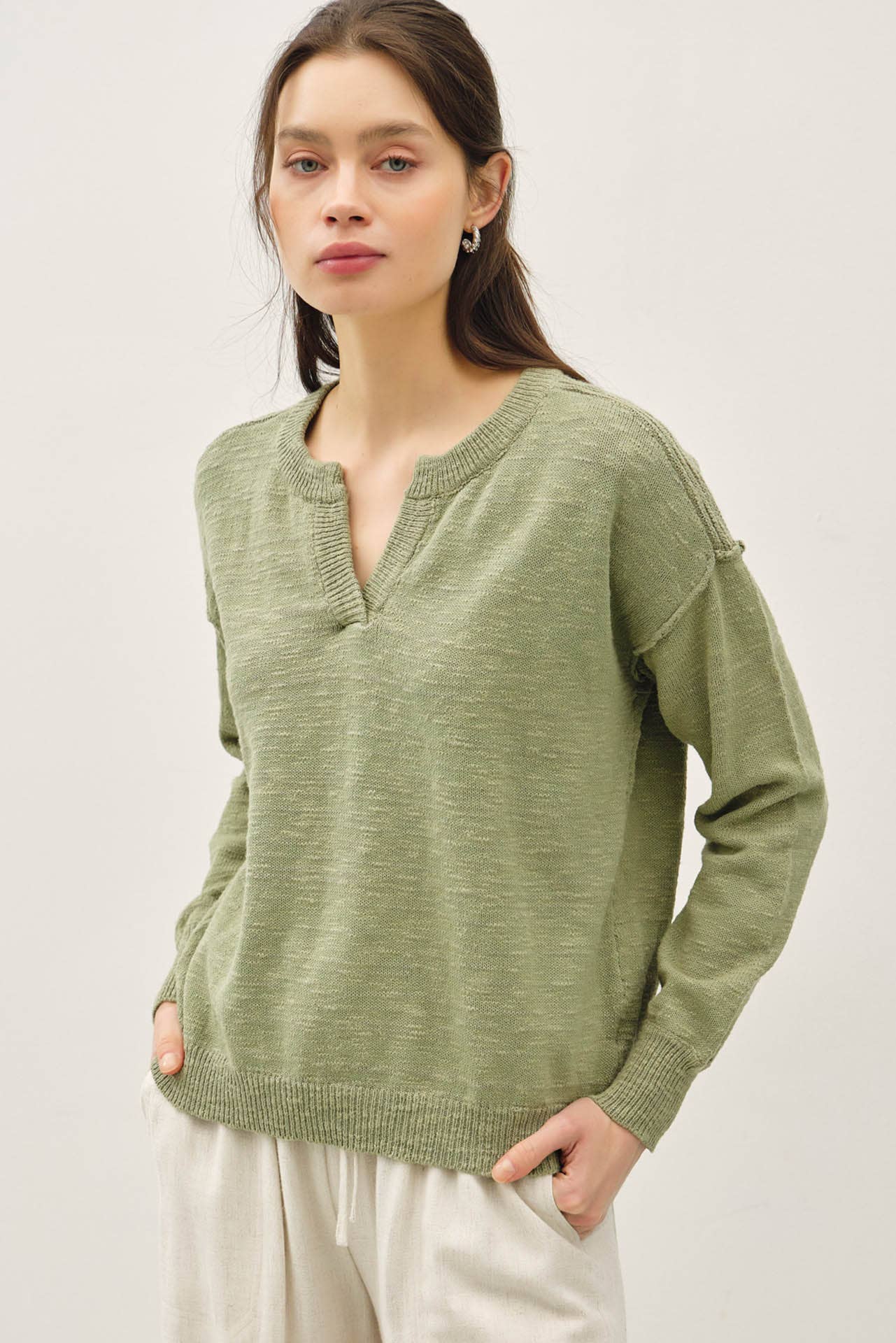 Wholesale Z820 Italian One Size Olive V-Neck Knit Soft Sweater LOOWIE