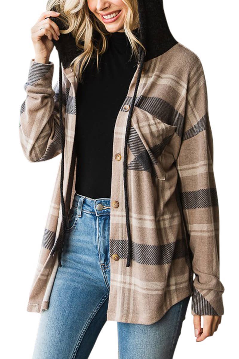 Brown Plaid Patchwork Button Down Drawstring Hooded Shacket for wholesale on Faire0
