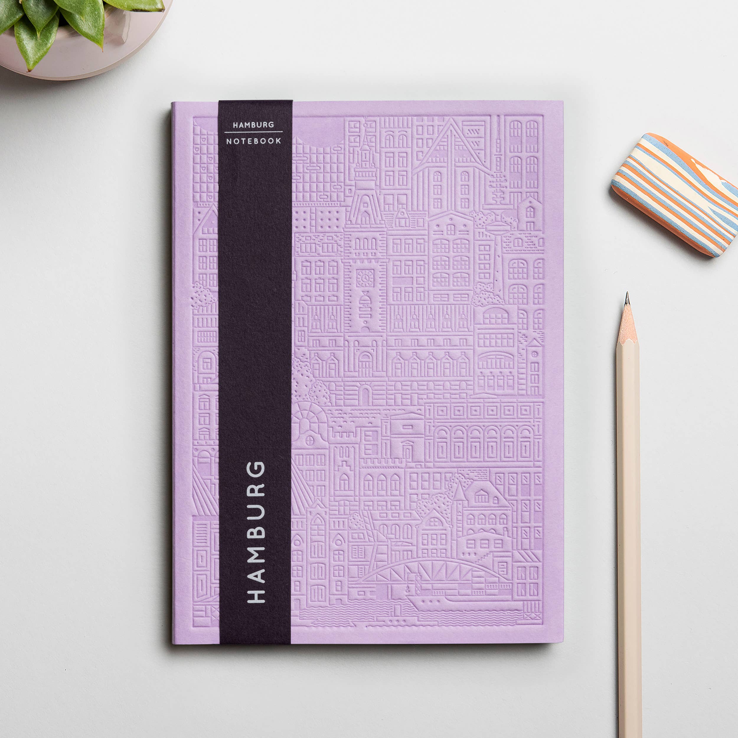 The Berlin Journal by The City Works. The cover is hand-pressed in our studio in Vienna, leaving a lasting impression on the cover, and hopefully on you too. The spine is also embossed with the name of the city, with our logo on the reverse. Each journal has 128 plain inside pages, bound together in Vienna using lay-flat binding. This binding method is strong, uses little glue, and allows the notebook to lay totally flat while using it. This maximises the creative area. Each journal is strapped in a paper bellyband, complete with a set of two writing guides: Ruled and Gridded. They're bold, simple, sturdy, and slot perfectly into the spine of the notebook. The journal is available in eight colours: Blue, Yellow, Lavender, Green, Red, Rust, Concrete and Sky Blue • B6 Size (175x125mm) • Hand-pressed cover • 128 blank inside pages • Includes set of 2 line guides • Available in eight colours
