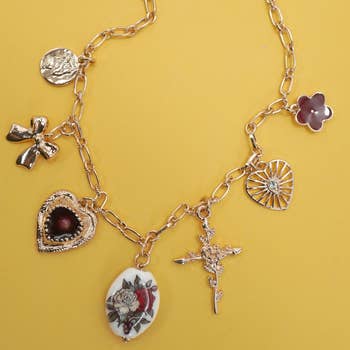 1 layer necklace featuring a gold chain link with a variety of fun charms throughout, including a puffy heart charm as the center charm. Lobster claw closure + 2 inch extender Length: Approx. 9" from top to bottom of chain, dangling charms add approx. 1"