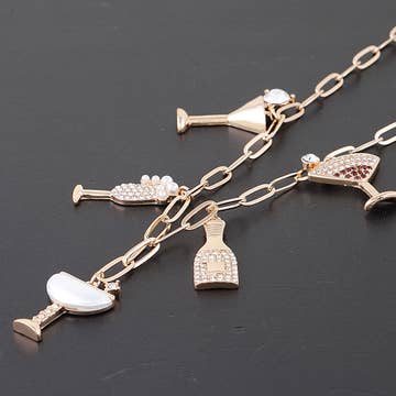 Necklace Size : 16.25" + 3.5" L Decor Size : 0.75" L Lead and Nickel Compliant This cocktail charm necklace adds a touch of fun and sophistication with its sparkling drink-inspired pendants. Designed on a chic chain, it brings a festive, fashion-forward flair to any outfit—perfect for parties, celebrations, or adding a playful twist to everyday style.
