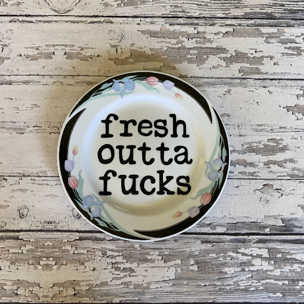PLEASE NOTE: The product photo shows a sample plate. The delivered product will be the exact text design on a different unique plate from our collection, if not the plate in the product photo. Our sassy plates are great for every occasion. They are great gifts for everyone you know, with a sense of humor that is. These are definitely not your grandmas china. Custom sayings are available! Due to age of plates, you may see some scratches or marks, but it definitely adds character. The plates are for decoration ONLY. Do not wash (I promise they're clean) or put in the microwave. Not for daily use or food. This plate is about 10 inches