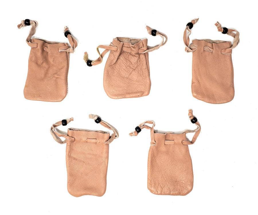 Made from leather, these bags/pouches are handmade. Great for gift giving, storing jewelry, herbs, and etc. Please note sizes are approximate. Size 3" L x 2"W with 1" opening when strings are not tightly pulled.