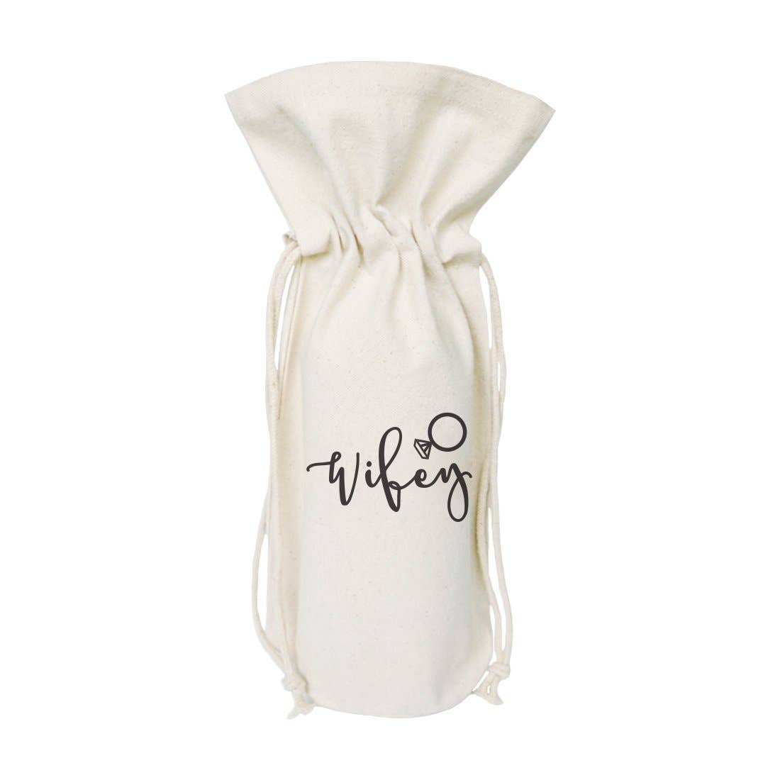 10 oz 100% cotton canvas. Holds a 750mL bottle. Matching drawstring closure.
