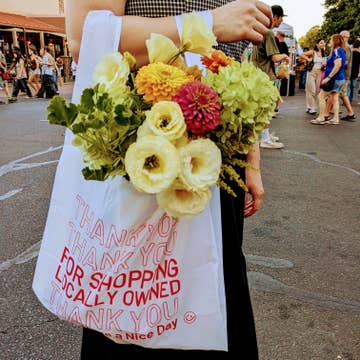 We collaborated with New Zealand-based digital artist, Julian Rowe, to create a tote full of gratitude for the folks who remember their reusable bags. This lightweight yet sturdy tote bag is crafted from 100% recycled cotton and screen printed on our iconic Promo Tote (LPTR-301). All seams and stress points are double-stitched for added durability. We used low-impact, AZO and phthalate-free inks to screen print the eyecatching bright red design. A cheeky nod to the classic "Thank You" single-use plastic takeaway bag, this tote inspires sustainability wherever it goes. Material Type: Recycled Cotton Material Weight: 5 oz Dimensions: 16"W x 15.5"H x 3" Gusset (Bottom) Handle Size: 1"W x 10" Drop Length Capacity: Perfect for a few books and a laptop. Care Instructions: Blot affected area with cold water, hang dry All of our bags are made in accordance with fair wage, fair labor, and SA 8000 standards for both environmental and social responsibility.