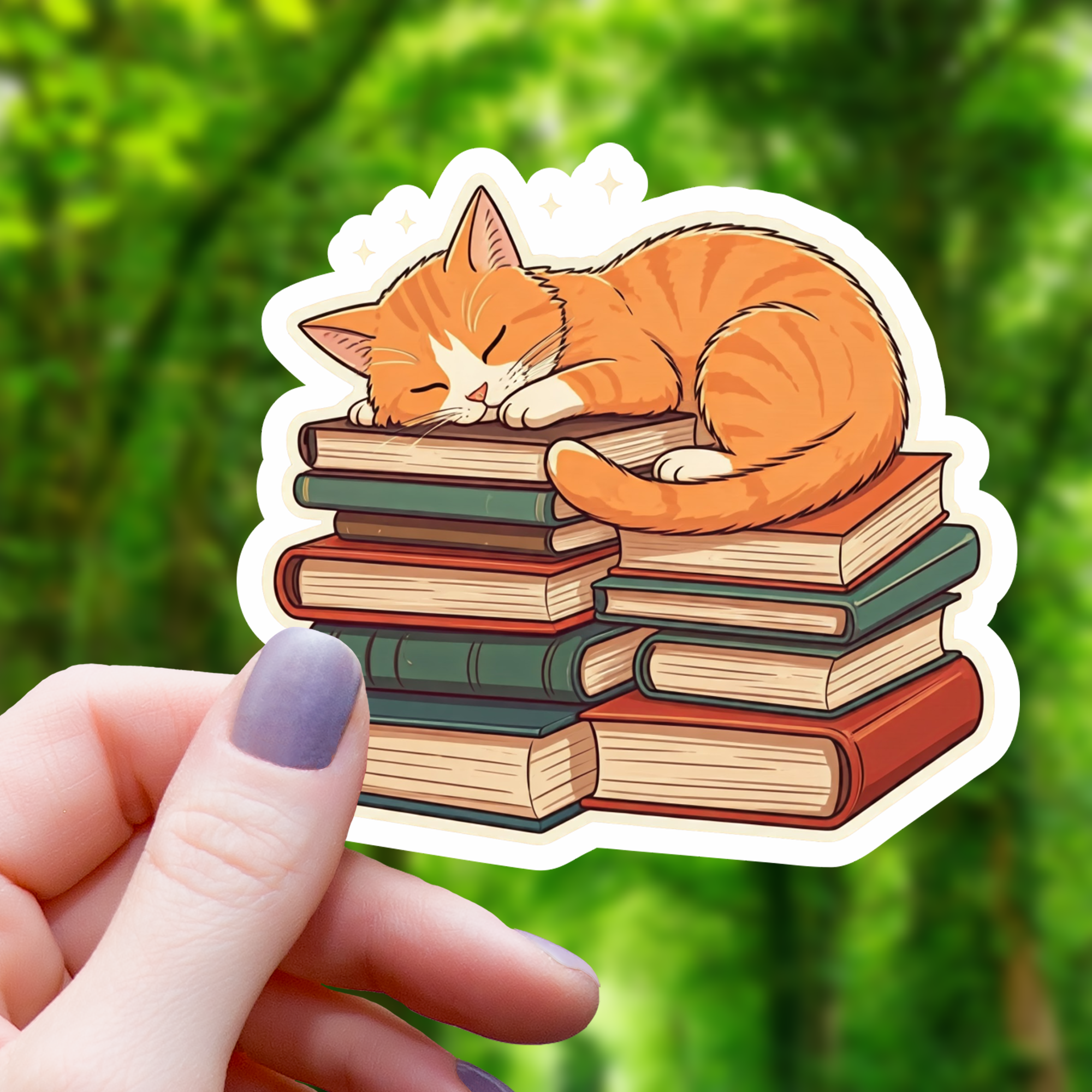Settle in with a good book and this cozy cat decal sticker! Featuring a calico cat lounging on a plush red chair, a stack of books, and a potted plant, this water-resistant vinyl sticker is perfect for laptops, water bottles, e-readers, book carts, and more. A must-have for cat lovers, bookworms, and cozy reading nook enthusiasts! Features | Matte vinyl sticker, water and fade-resistant laminated finish Size | 2.5” x 2.24”
