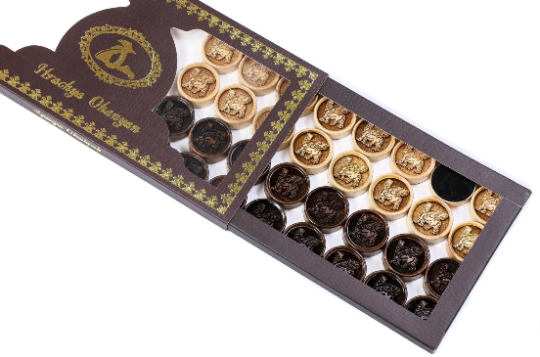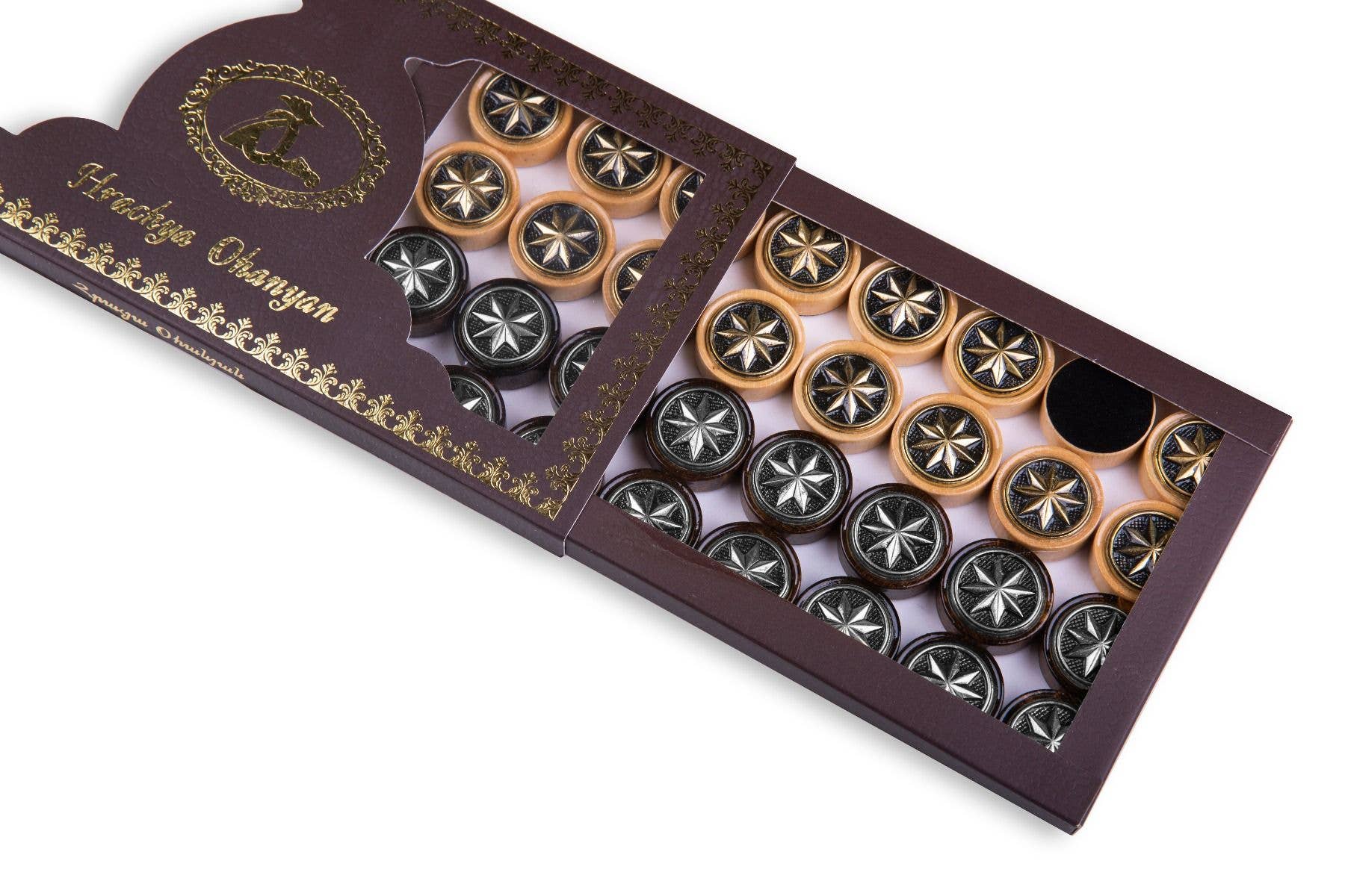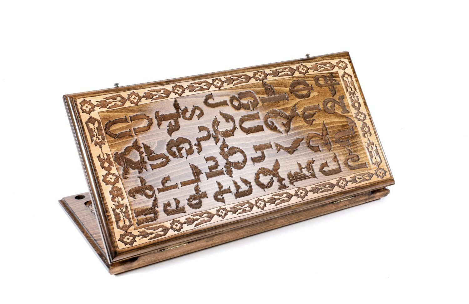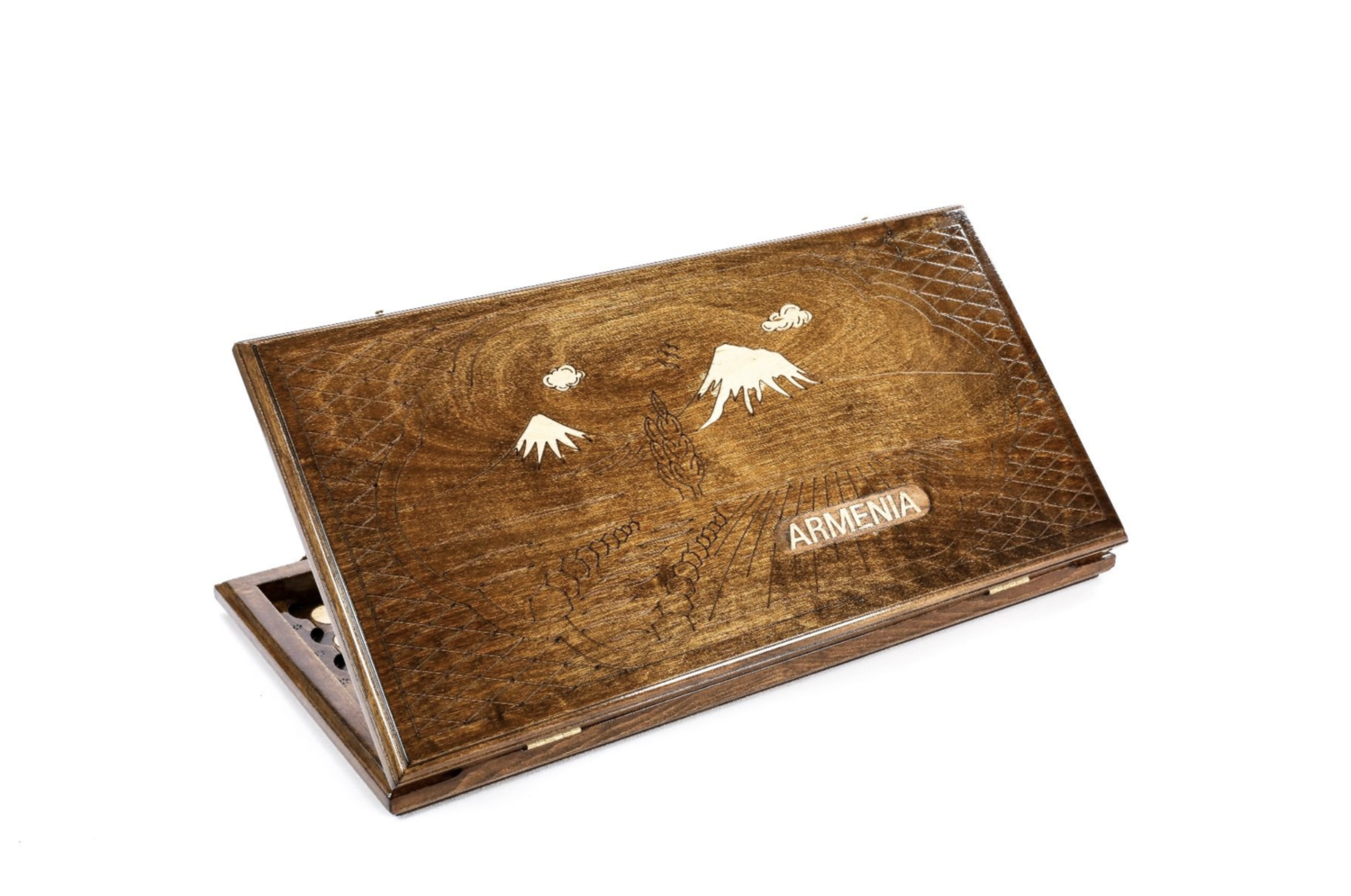 This classic backgammon is carved from one piece of beech wood. Engraved on one side is an Armenian ornament. Armenian ornaments are rich in a variety of motifs, types, and forms. The other side of the backgammon is designed for the game of checkers. This model is completely handcrafted. It is varnished. The hinges and locks are made of cast bronze. The entire playing field is hand-carved of one piece of wood. The set includes: * 32 playing pieces, made of beech and walnut wood, with velvet fabric applied to bottom of each piece, * Dice made from billiards balls, * Branded case with wooden handle. Our products come with a 25-year guarantee certificate.