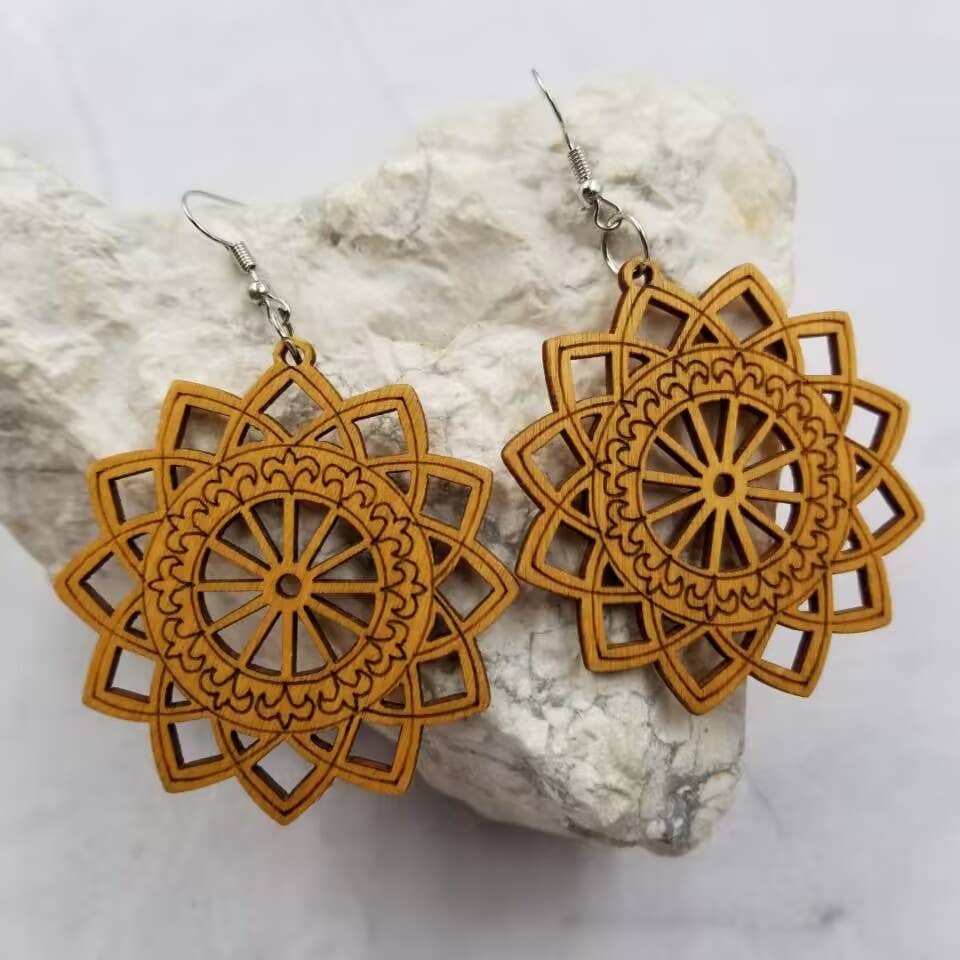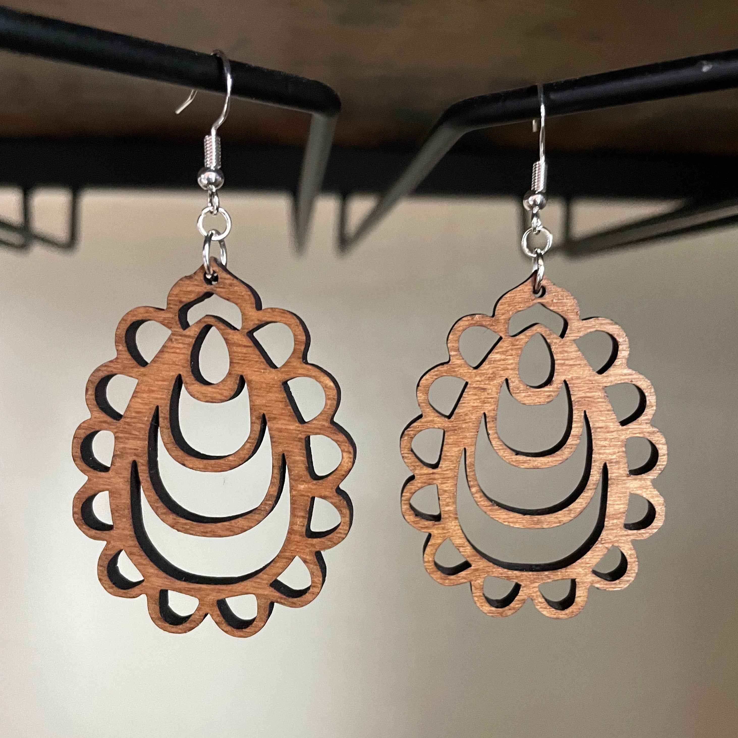 Handcrafted, laser cut wood earrings • Lightweight • Ear wires: sterling silver or antique brass • Size: ≈ 1.4" wide x 2.45" tall