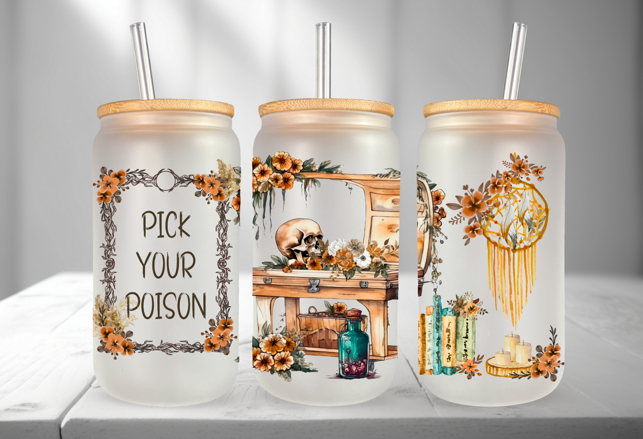 This Halloween glass cup is perfect for your Halloween party. Use it as a punch or serve up some candy apples. Please note there are 4 options to choose from: Frost or Clear glass can with all black or clear design. You can also choose from a mixed variety pack that offers 1 of each (See sample pictures) ✨CUP DETAILS✨ up to 18oz. Beer Glass Coffee Can Bamboo Lid & Staw Included Designs are printed directly on the cup. There is NO vinyl or paint. Design will not crack, peel or fade. (Please note straw is plastic and approx. 7-8" in length) ©Luxxe Creations, 2022. All images, designs and text are copyrighted and cannot be copied.